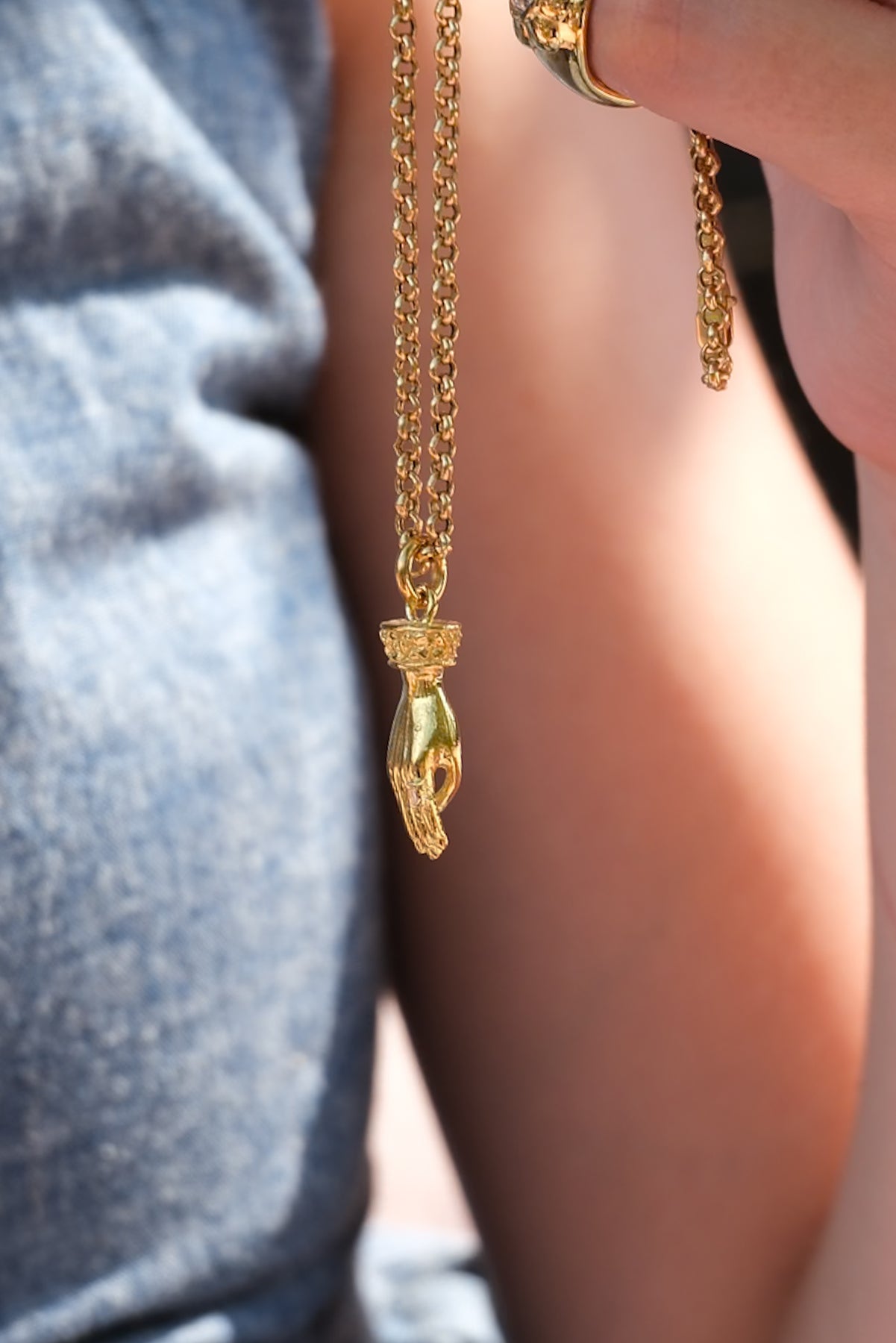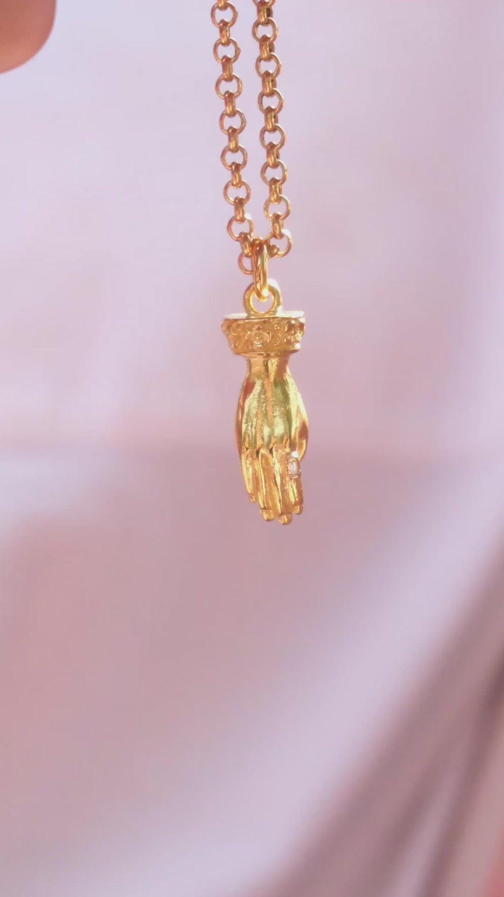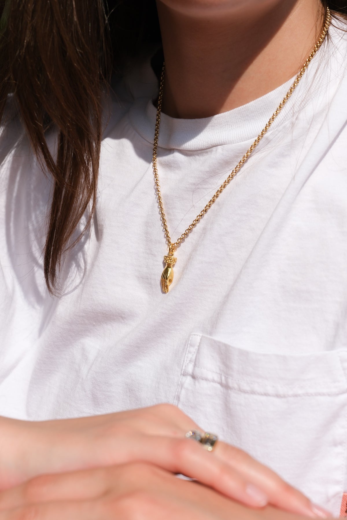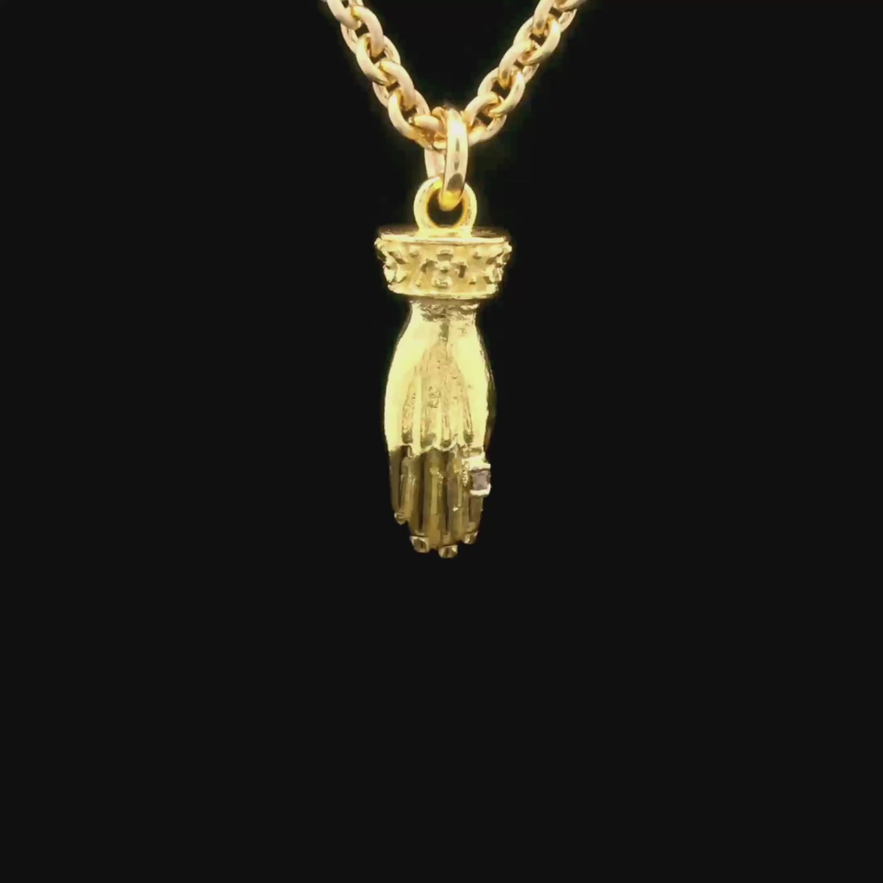 Solid carved hand pendant with baguette diamond ring