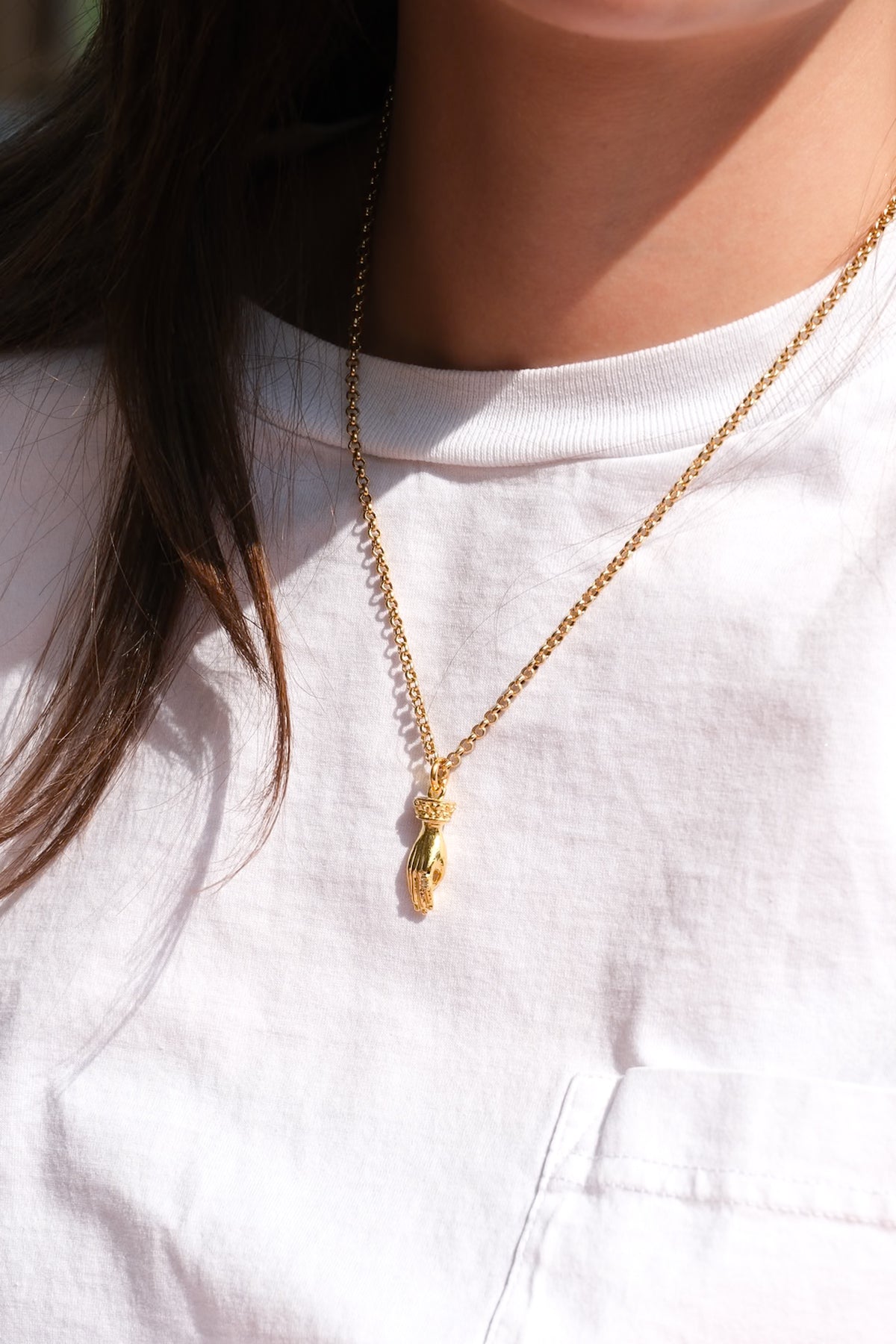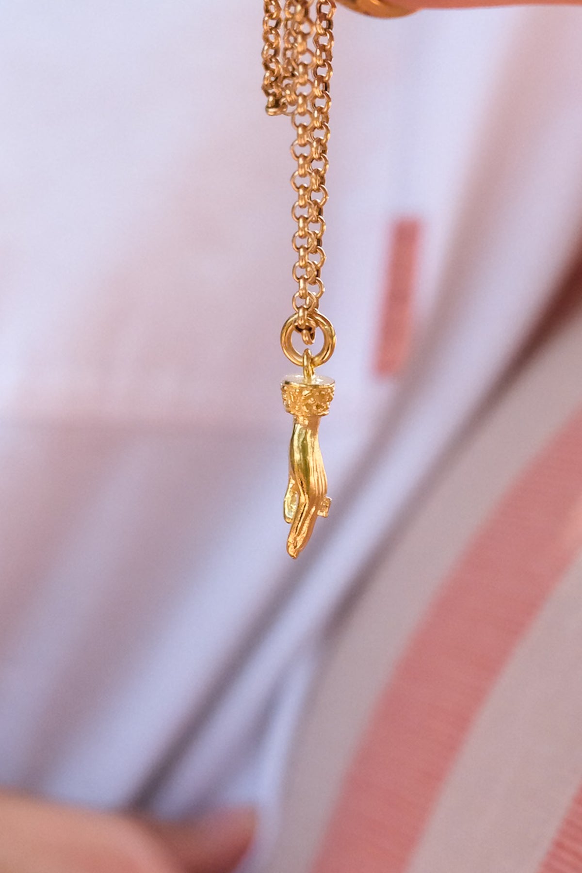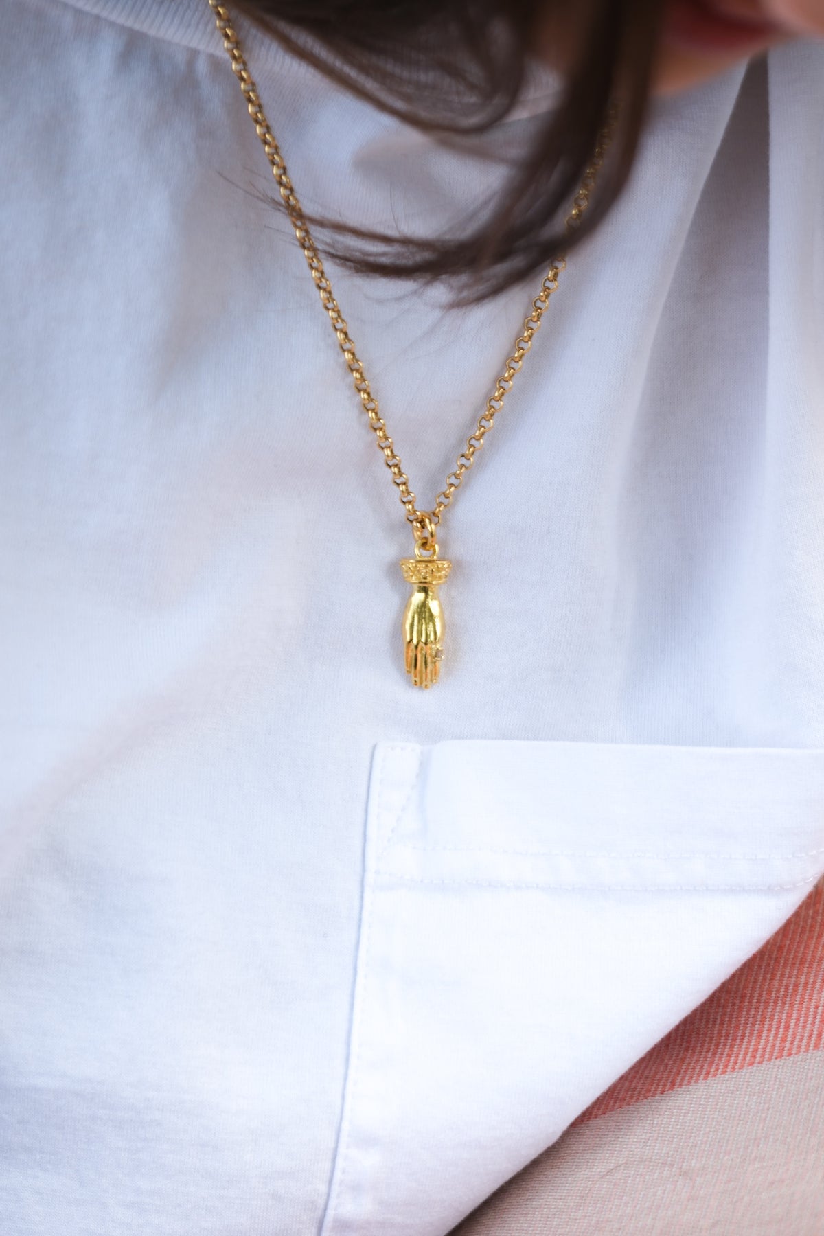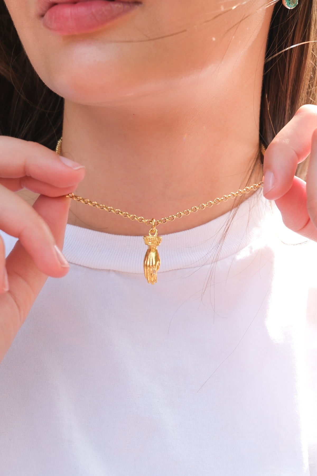 Solid carved hand pendant with baguette diamond ring