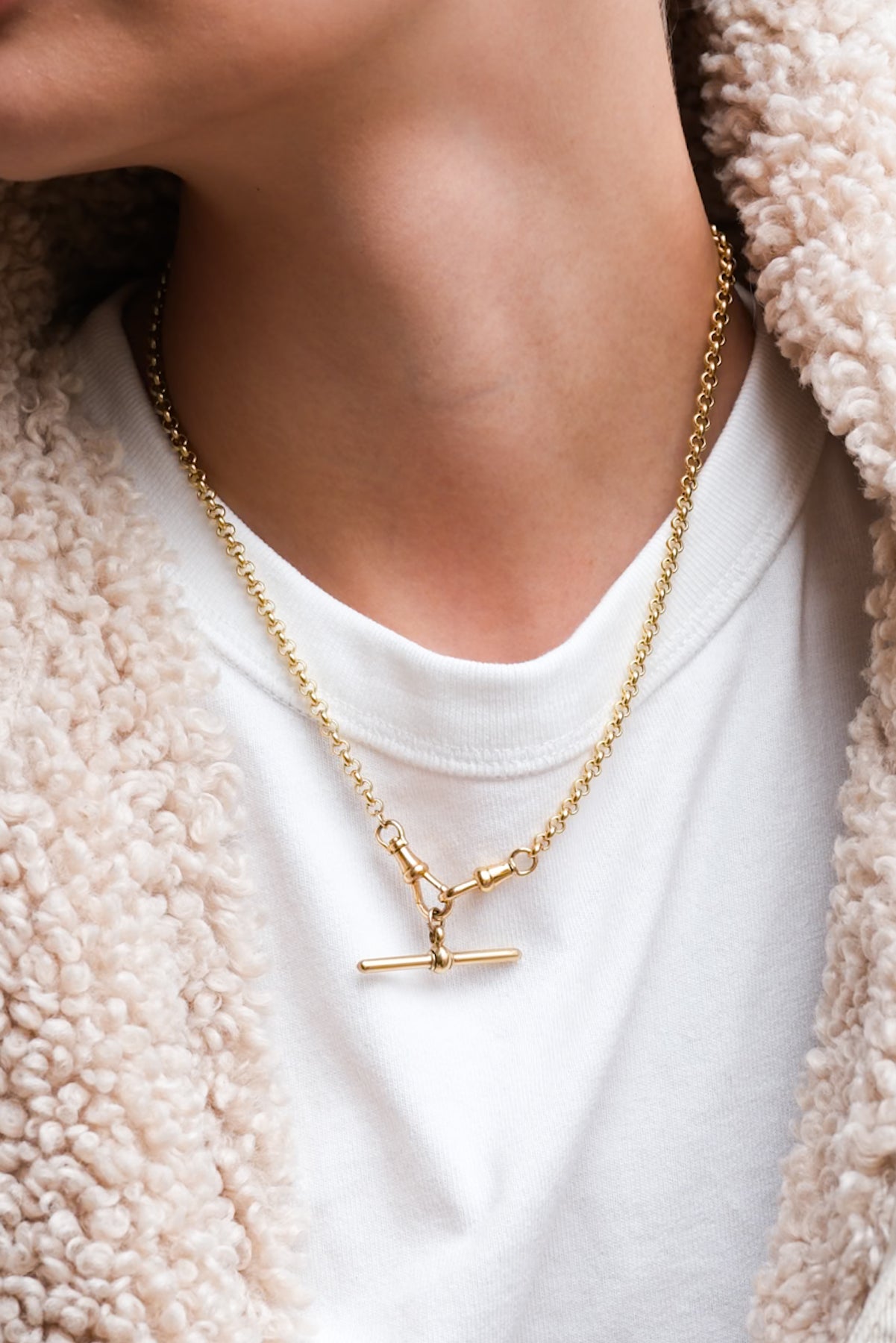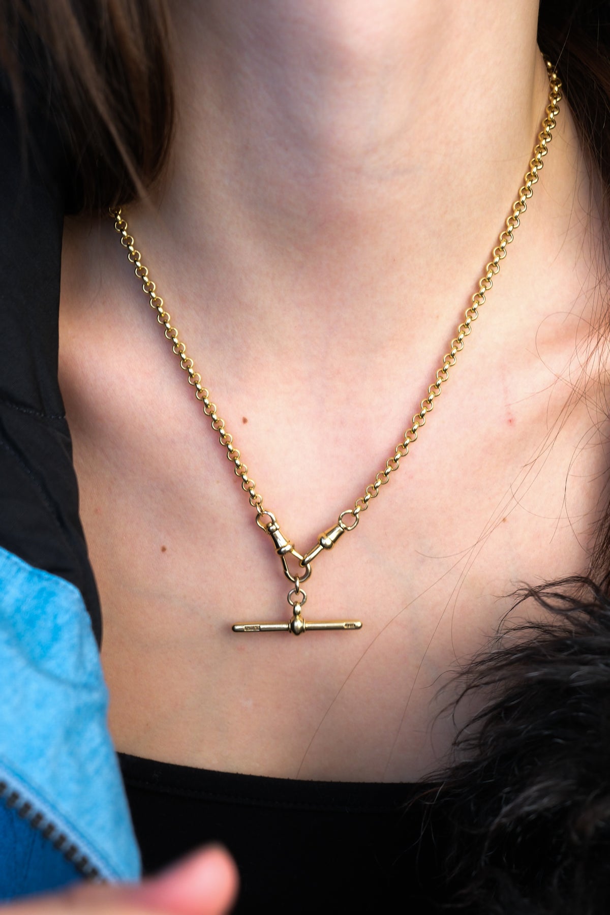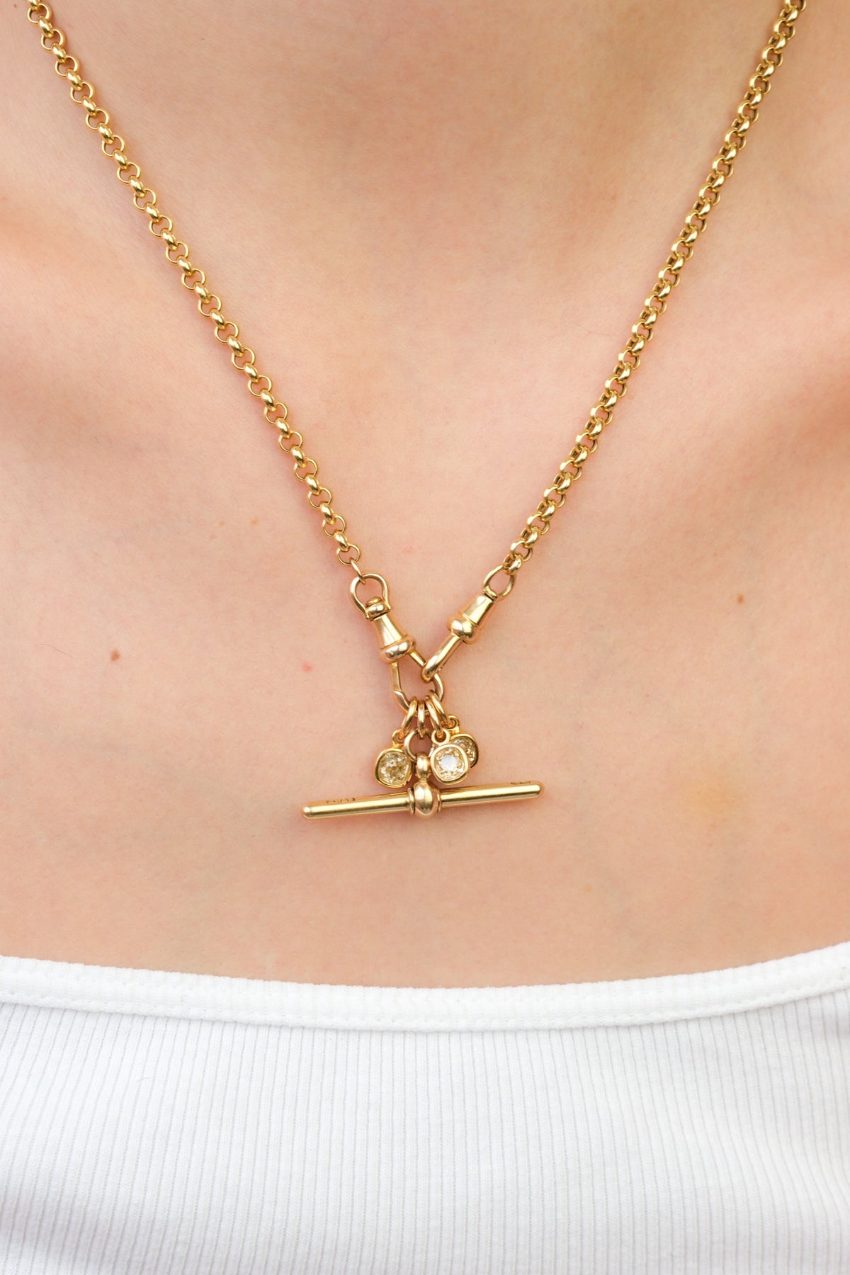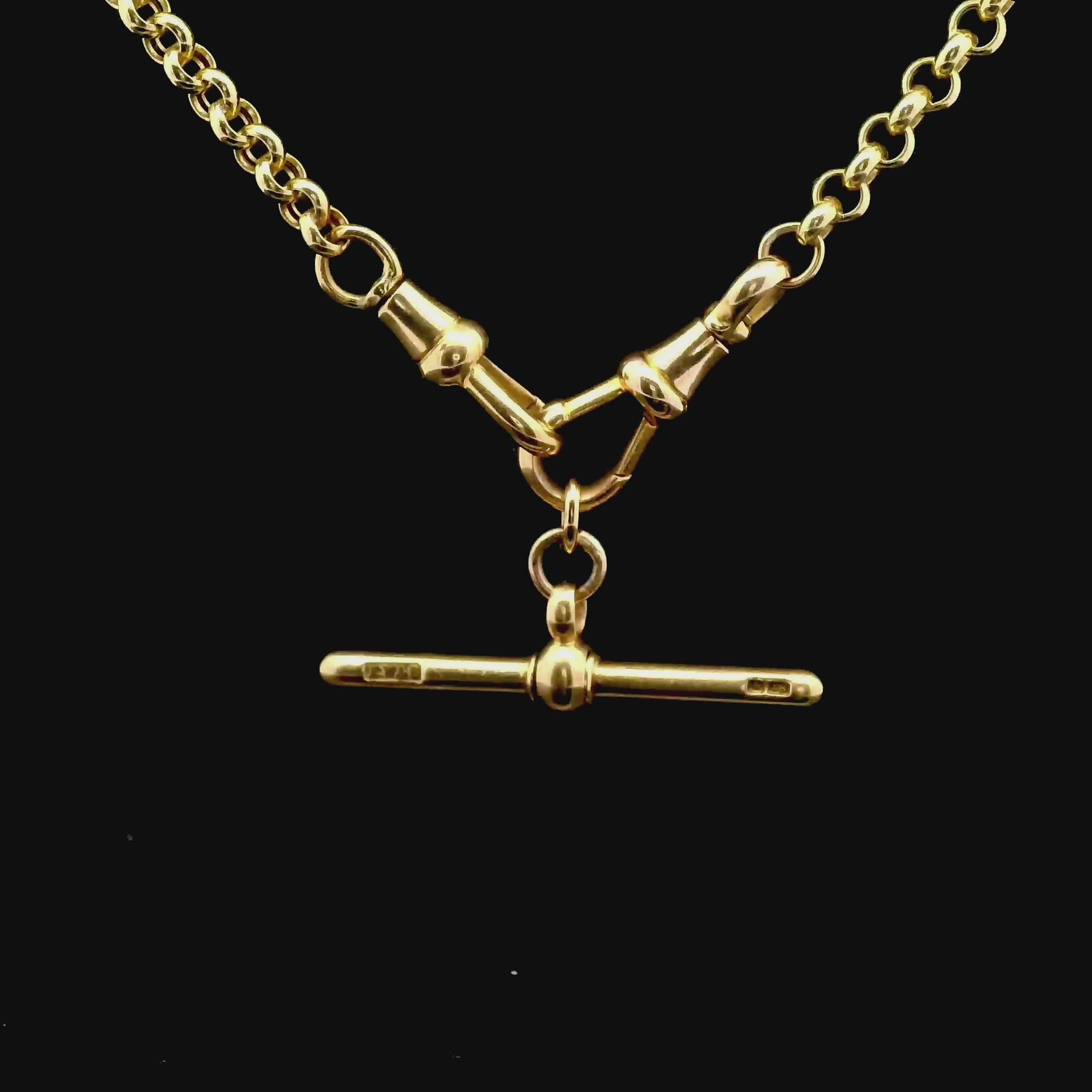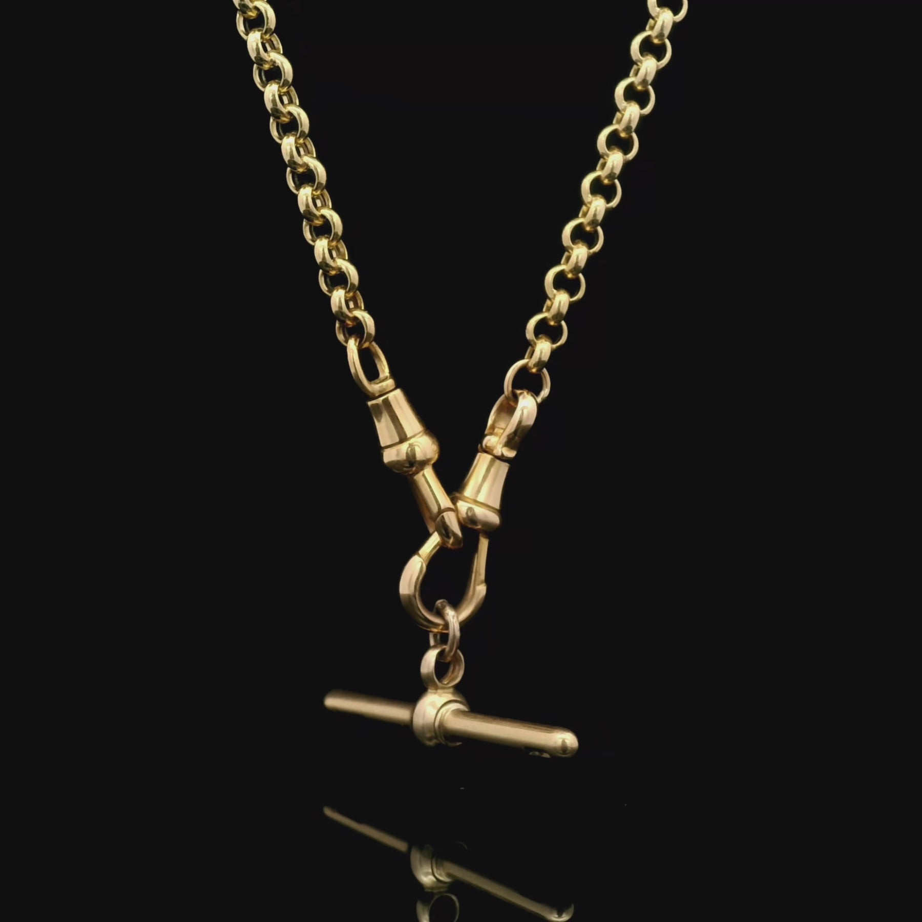 18k rolo (5mm) chain with a pair of antique dog clips and antique 18k T-bar