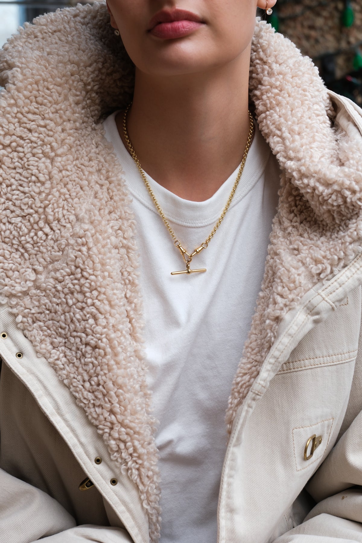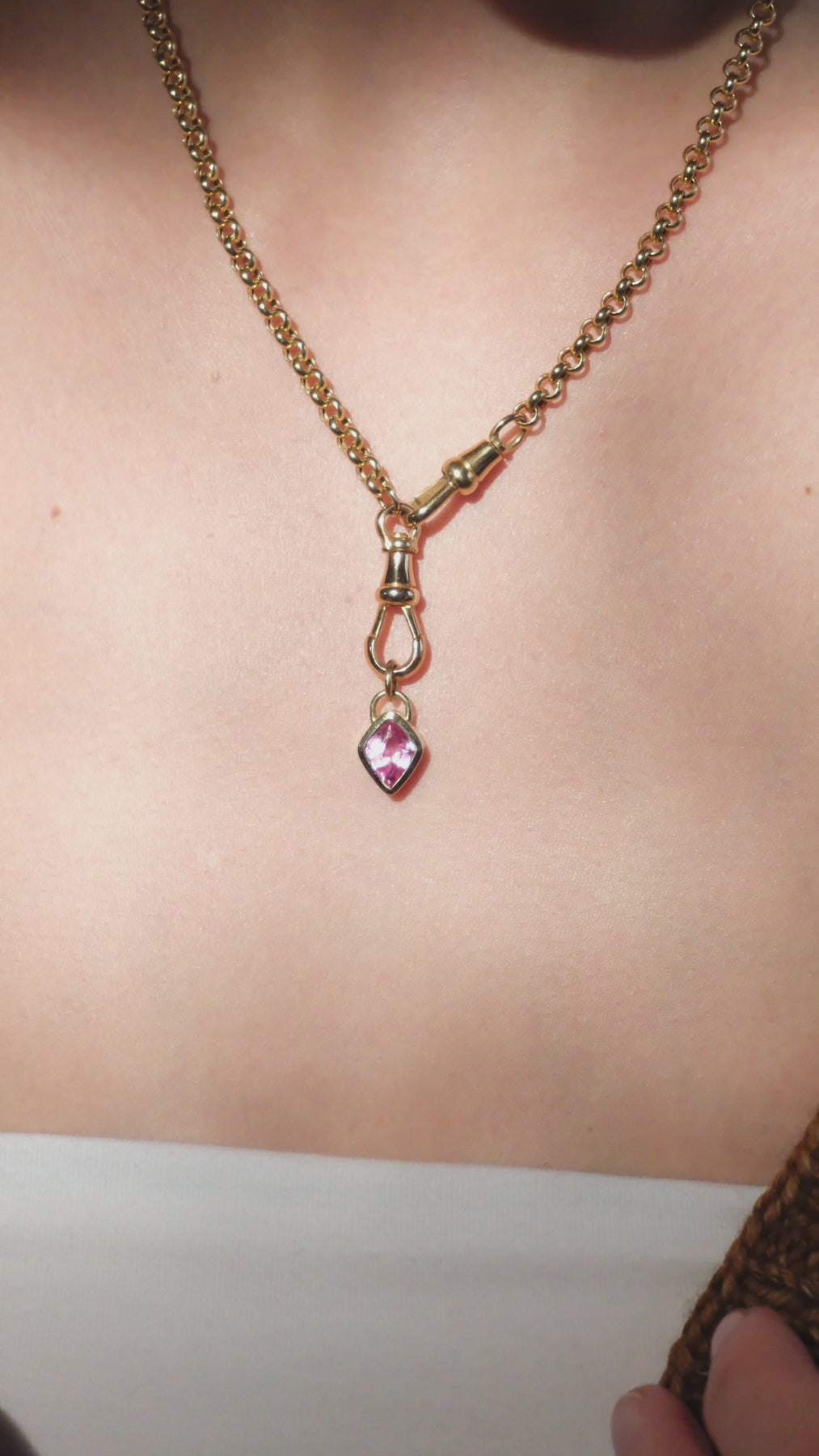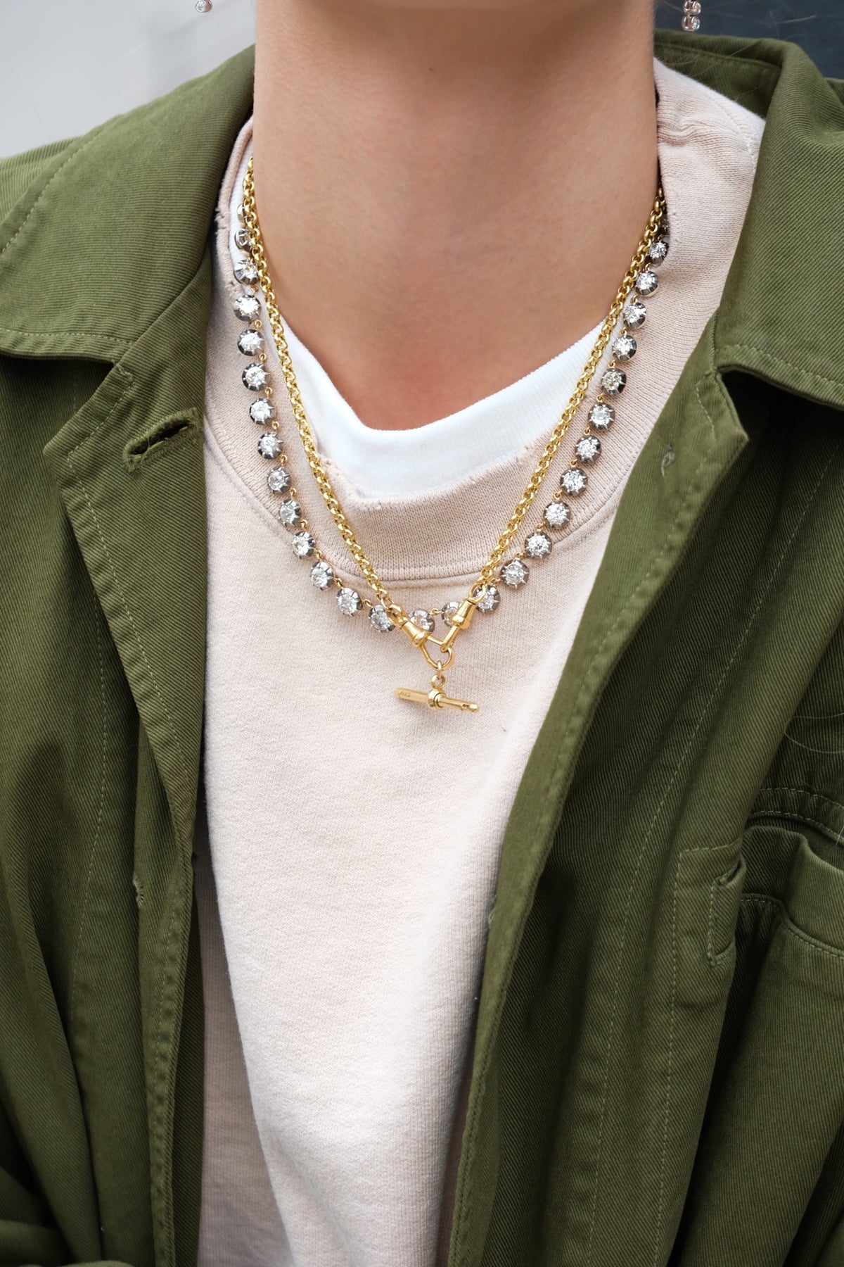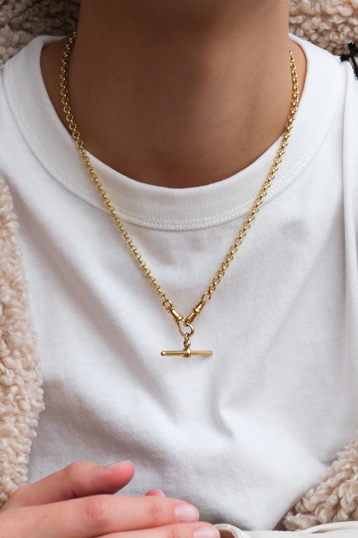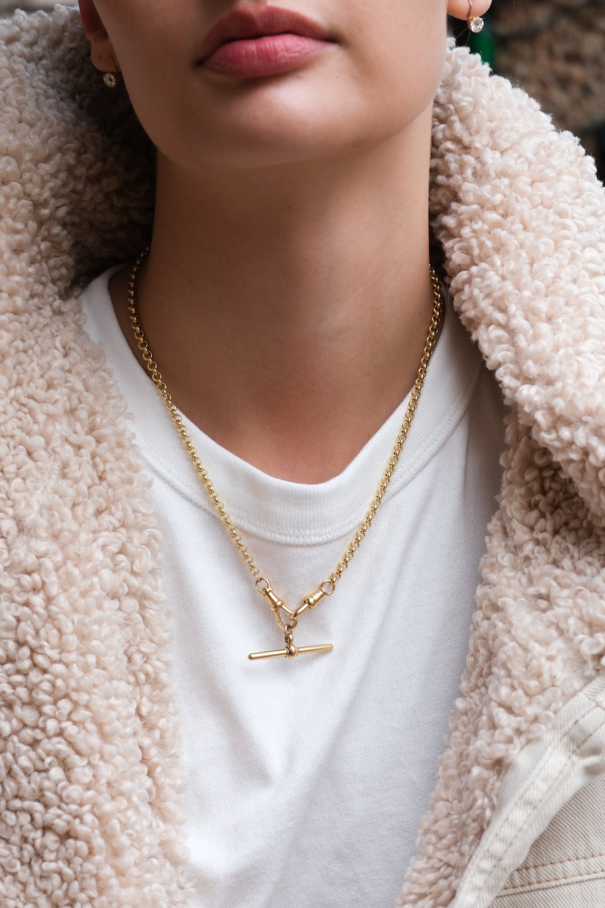 18k rolo (5mm) chain with a pair of antique dog clips and antique 18k T-bar