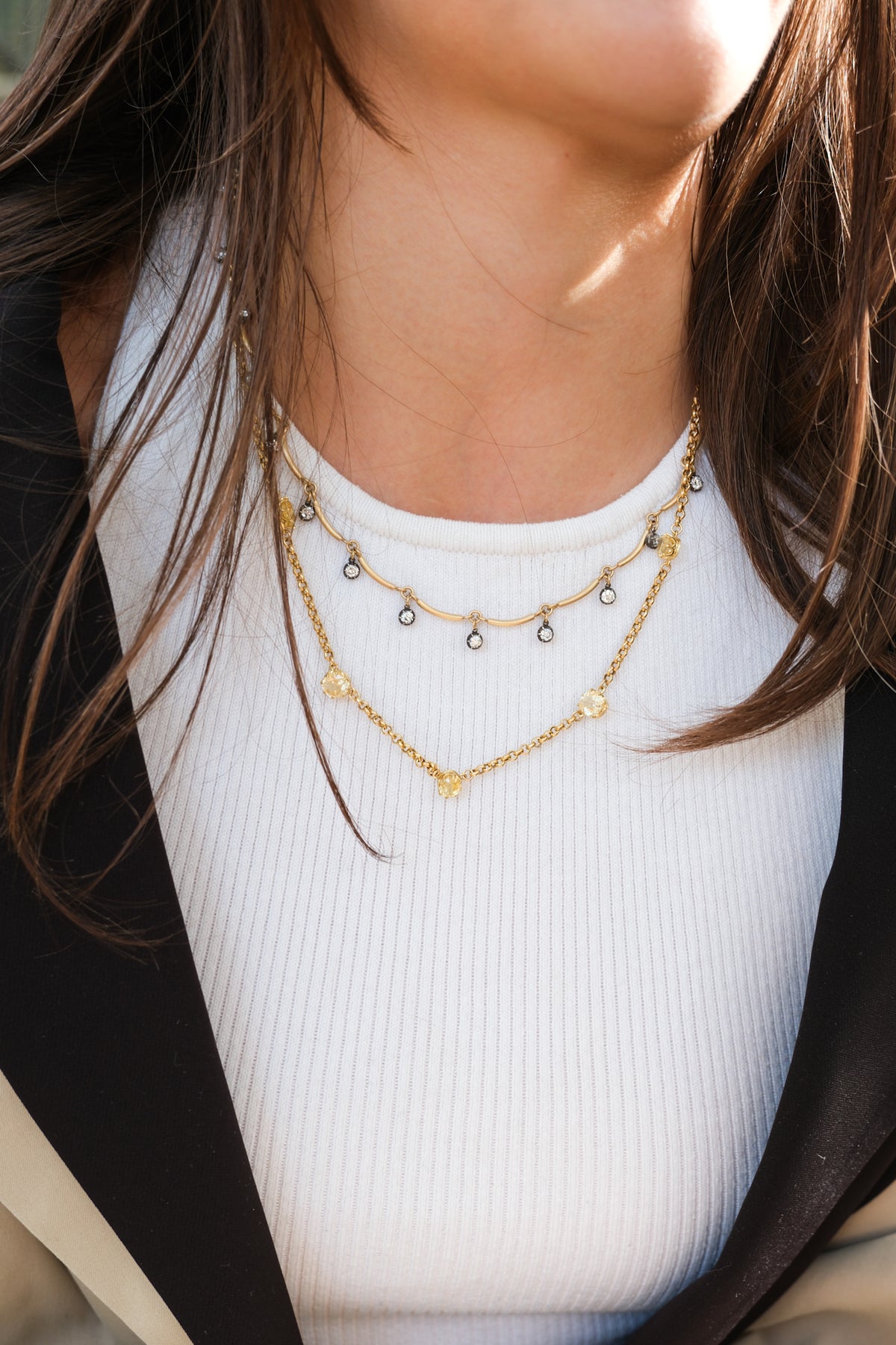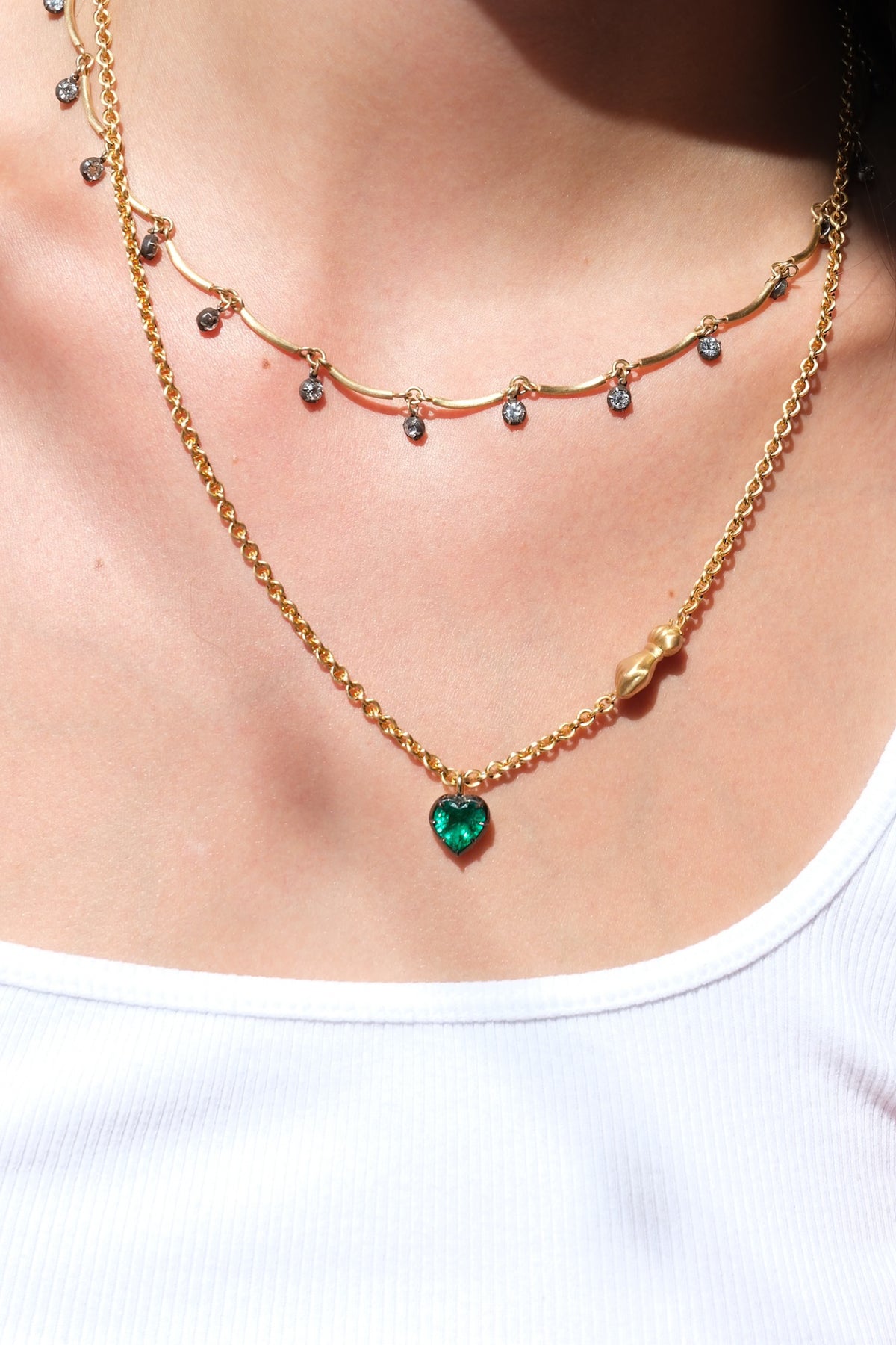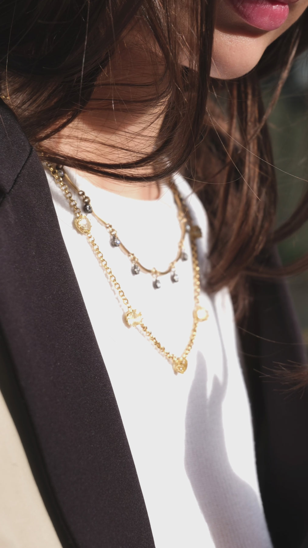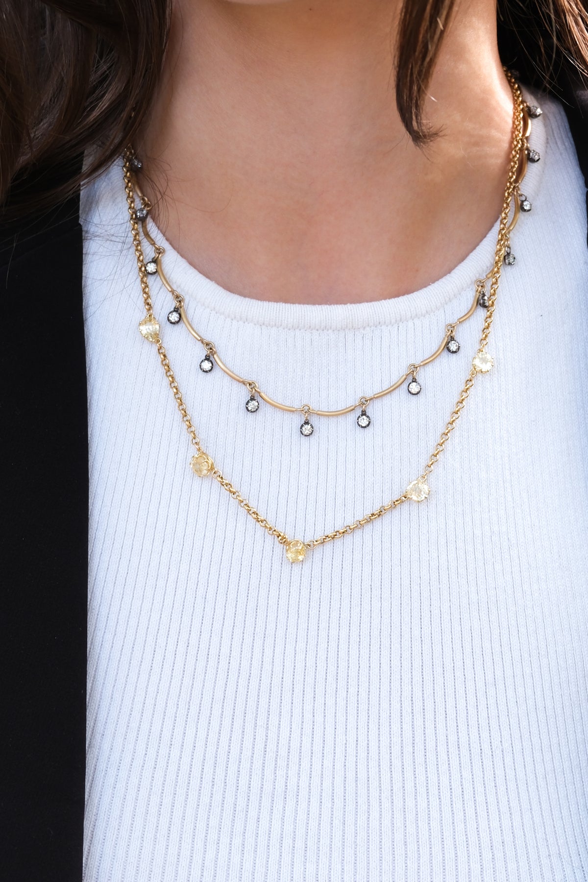18k handmade scallop chain with 3.63 ct old European cut diamonds in oxidized silver collets that go all the way around.