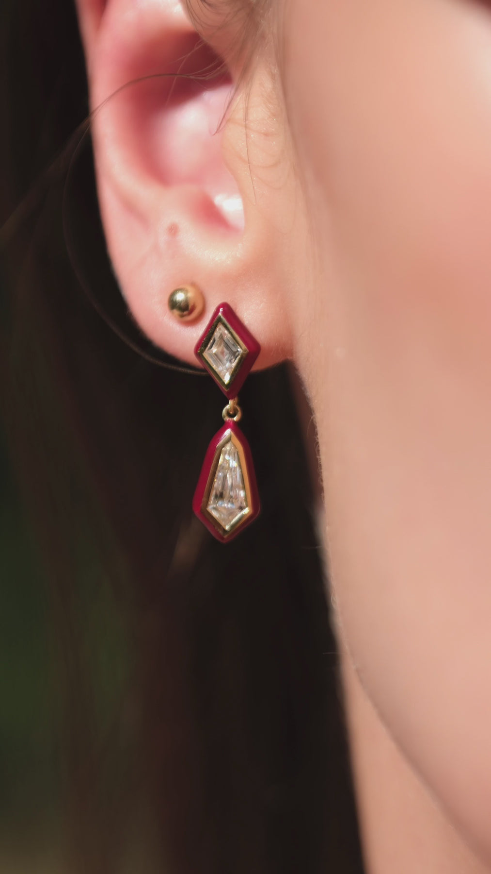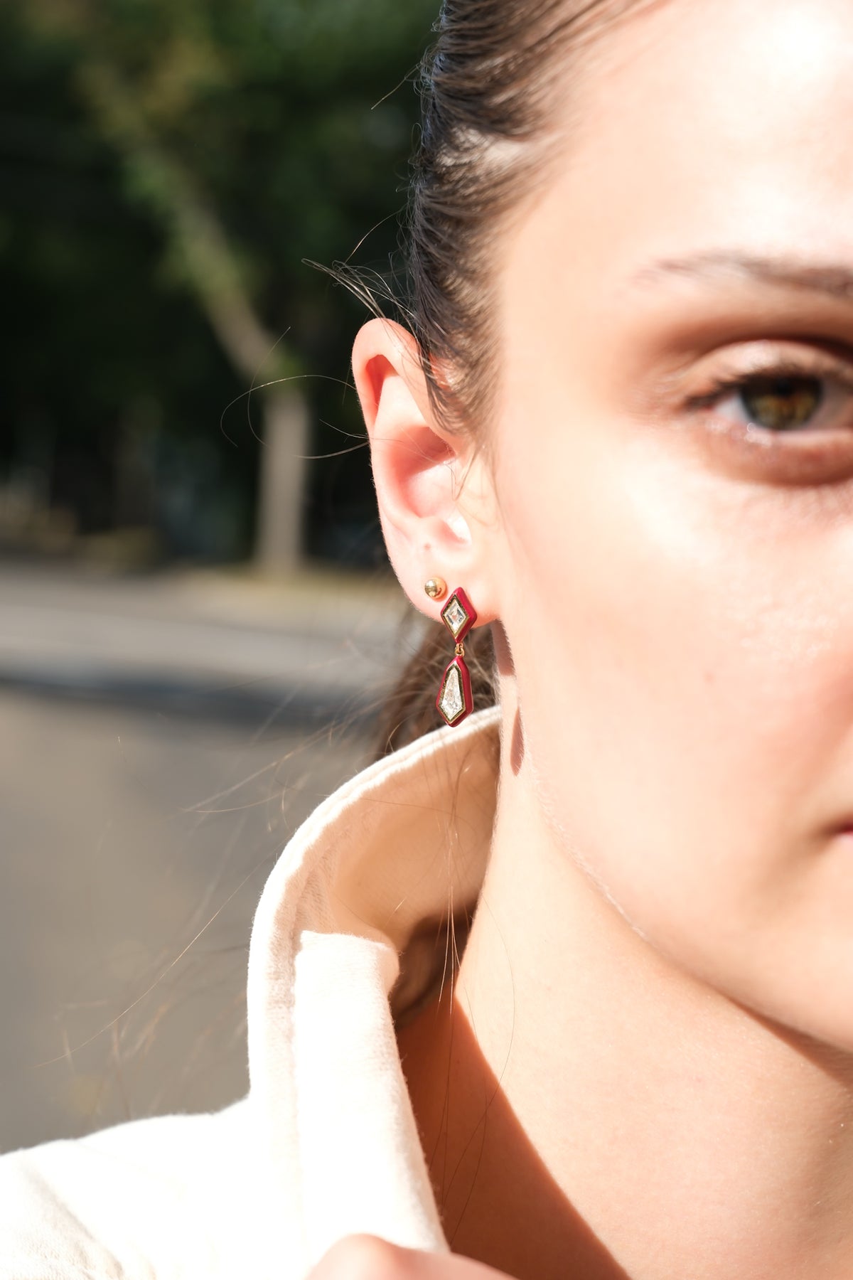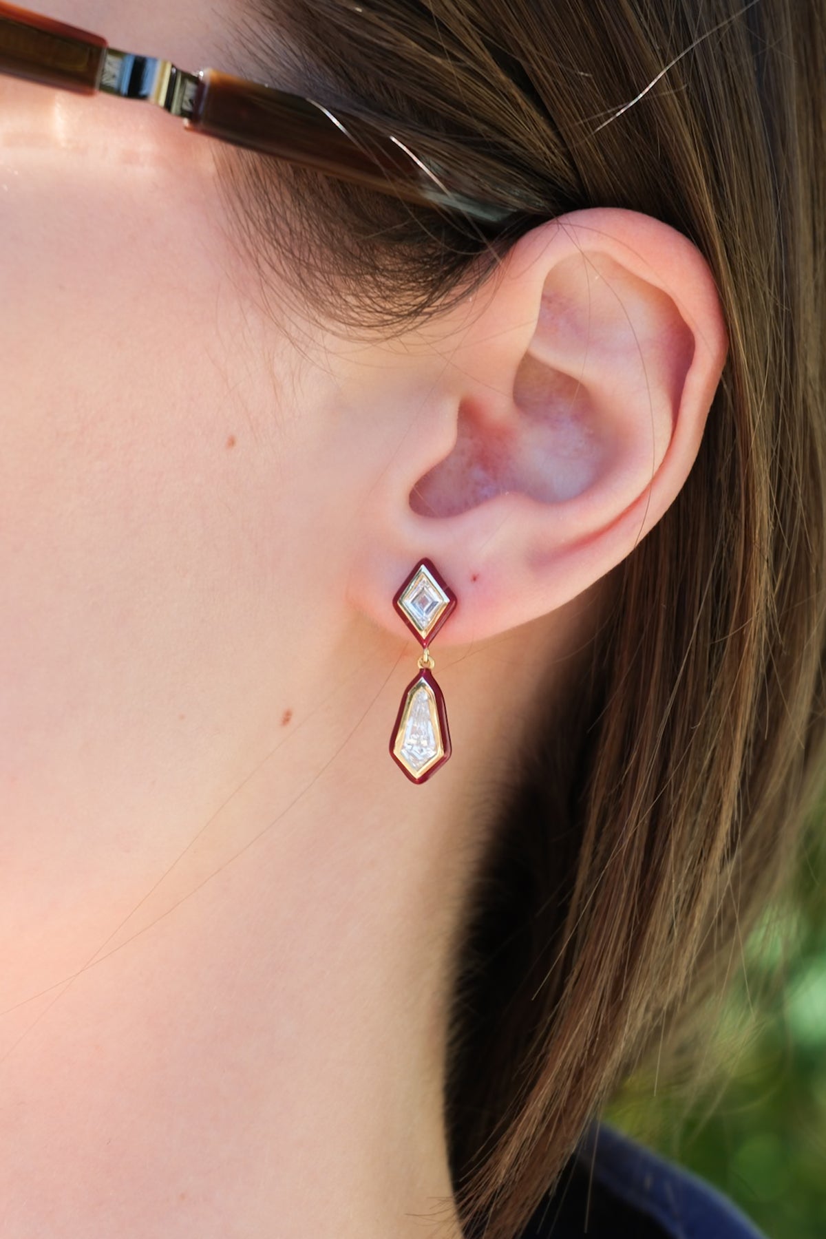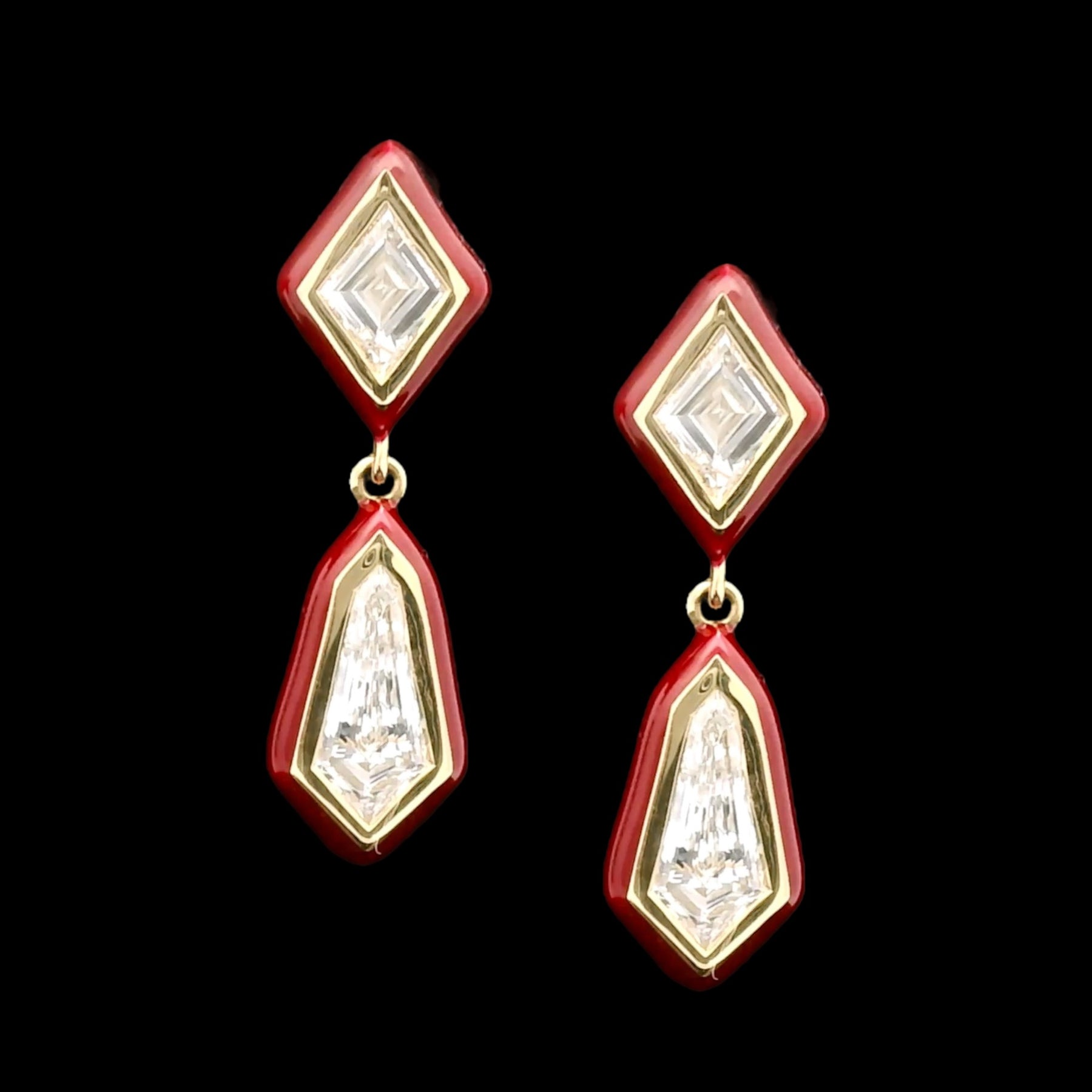 .46 ct lozenge (F-G, VS1) and 1.01 ct kite (E-F, VS1) earrings with maroon enamel in 18k yellow gold