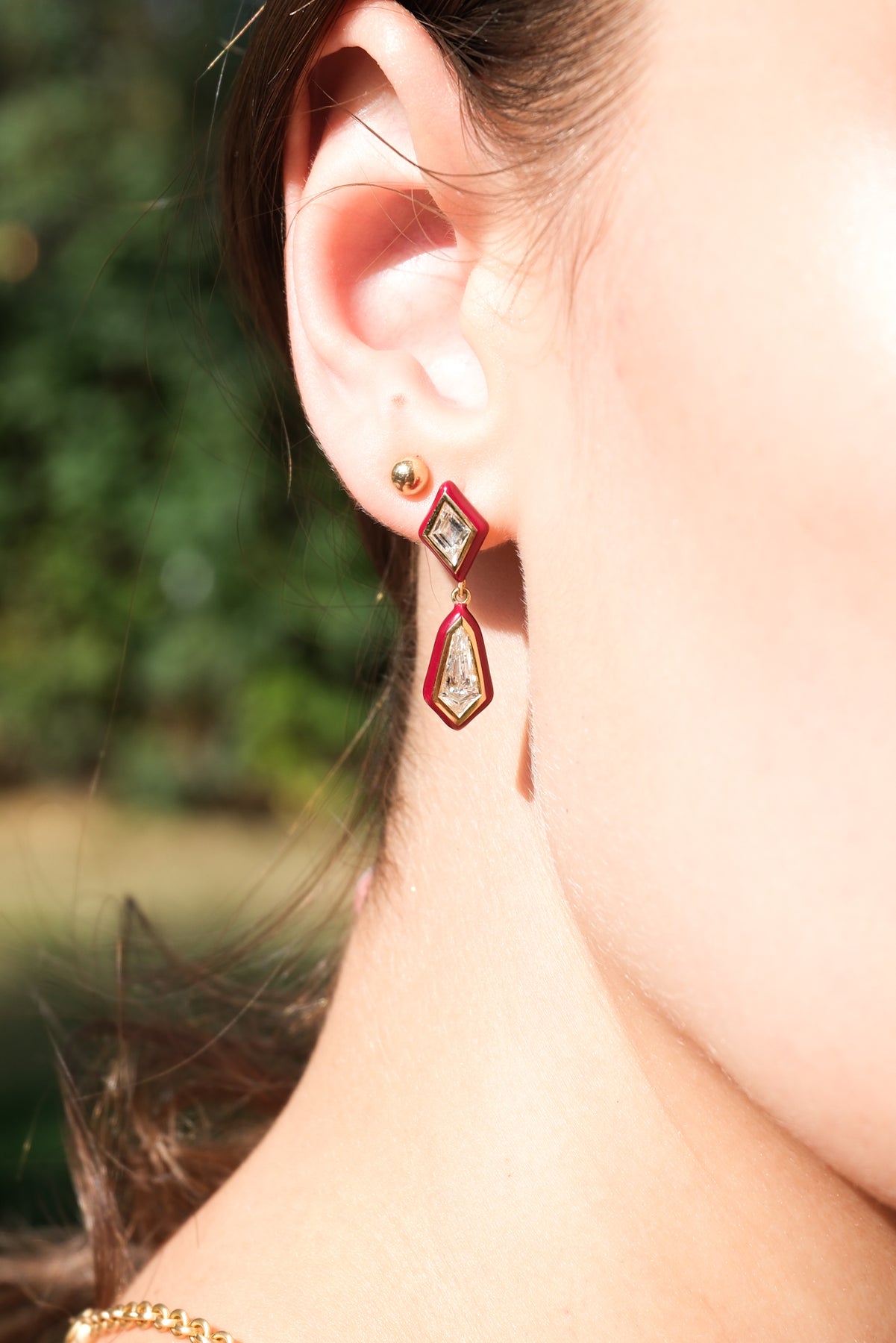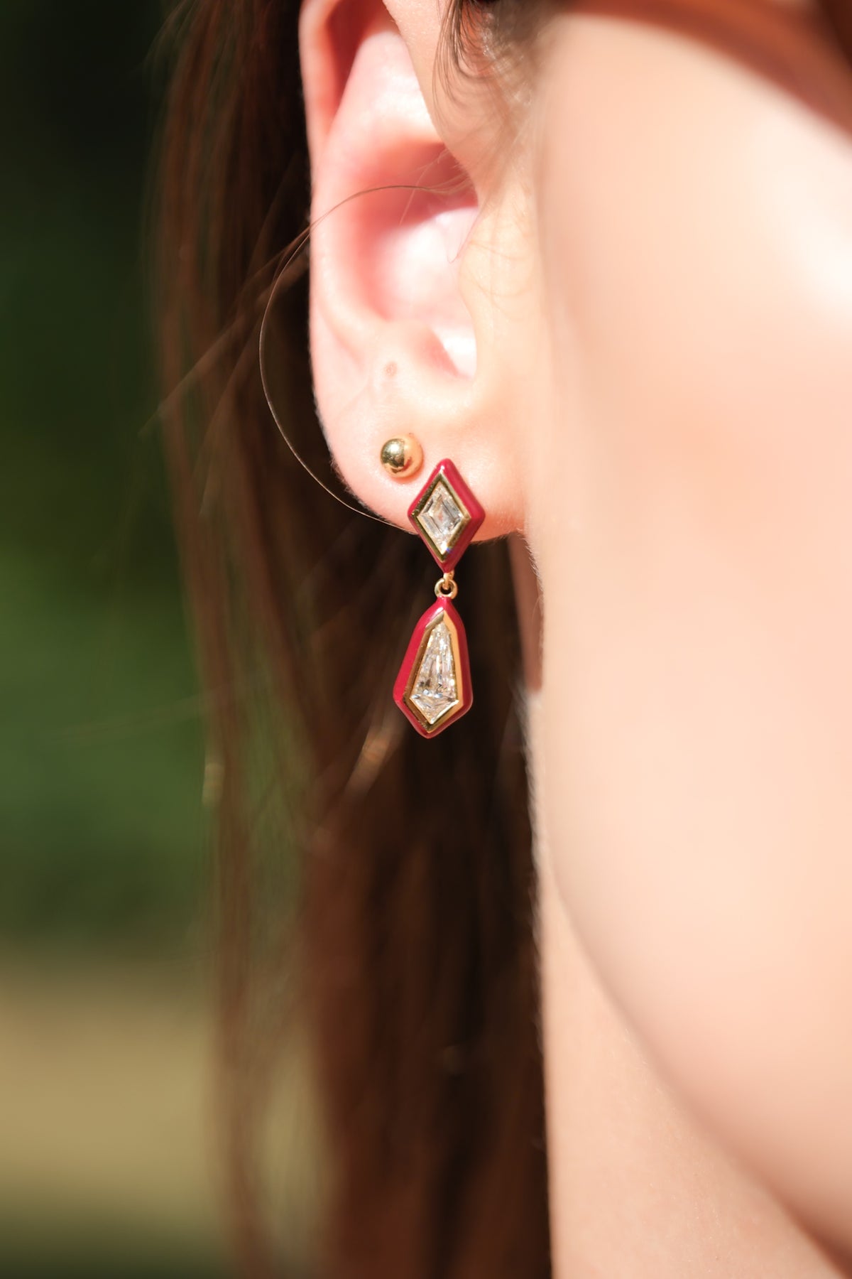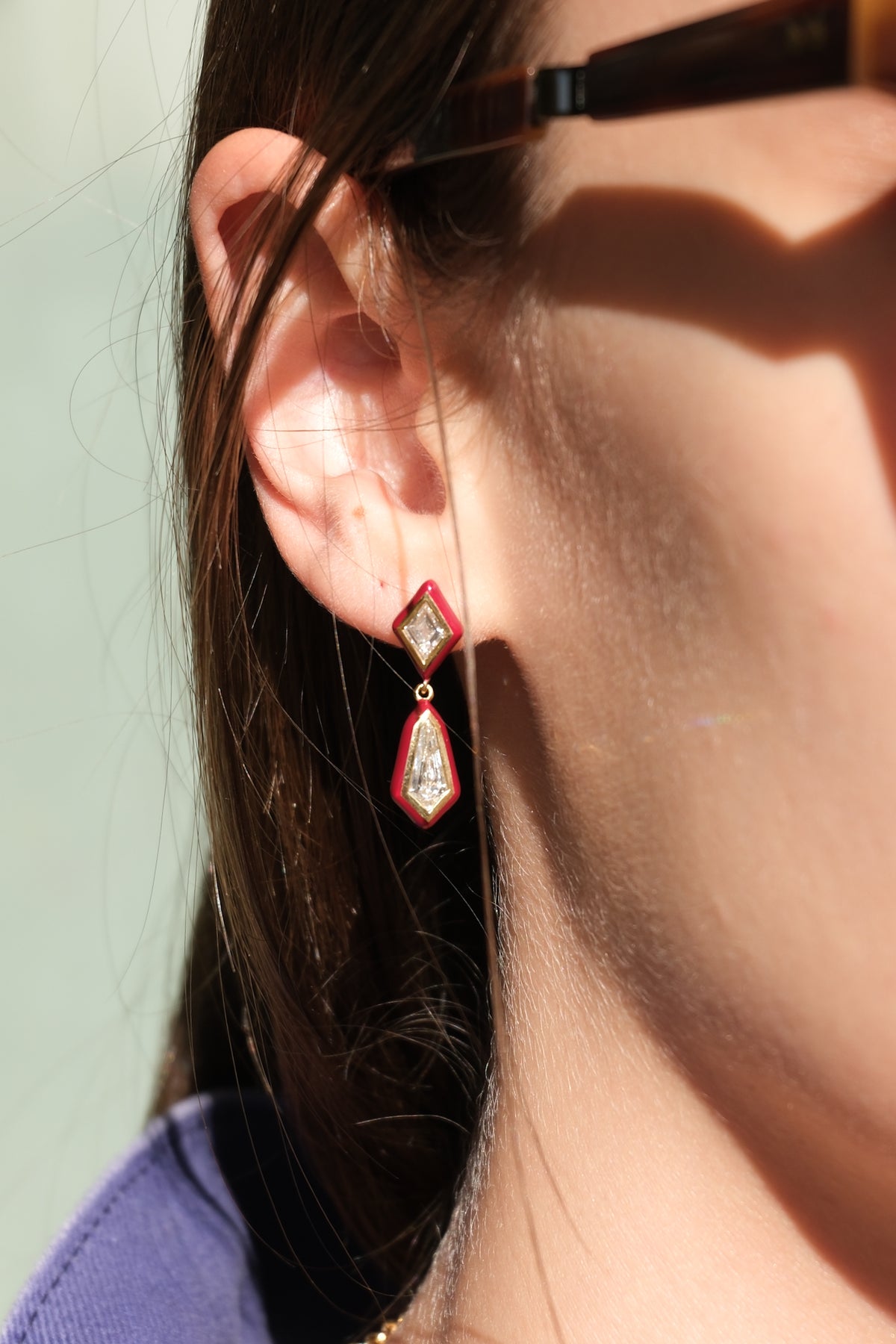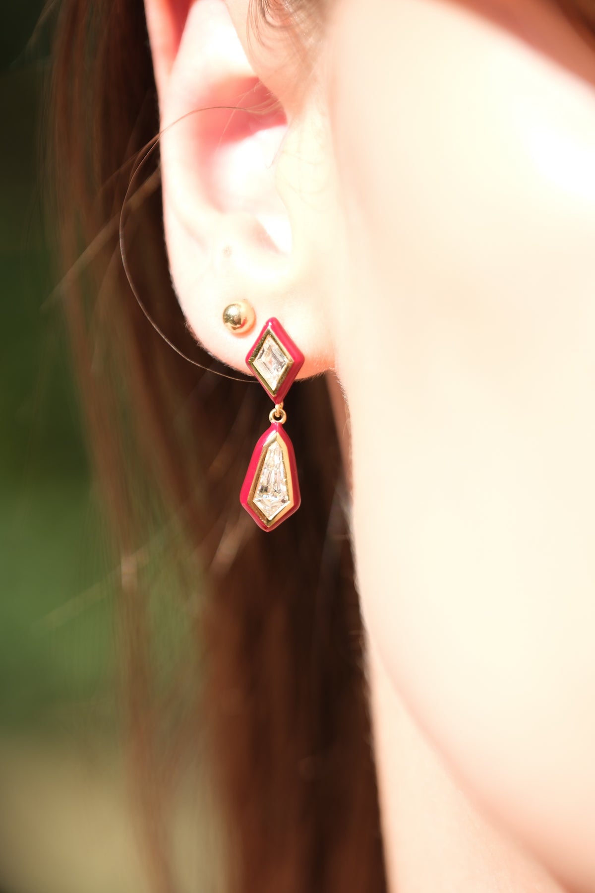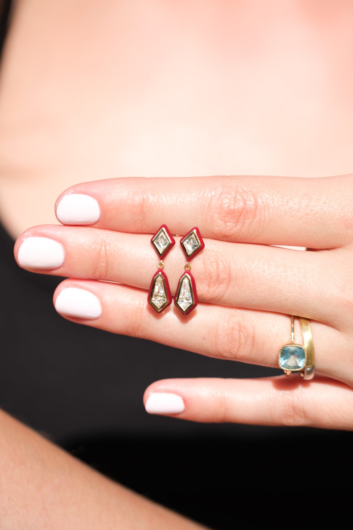 .46 ct lozenge (F-G, VS1) and 1.01 ct kite (E-F, VS1) earrings with maroon enamel in 18k yellow gold