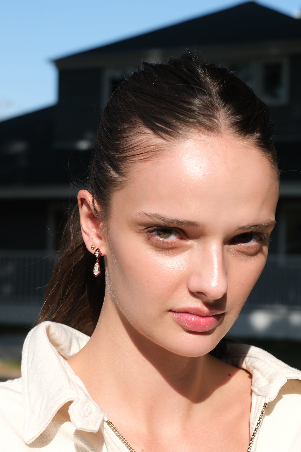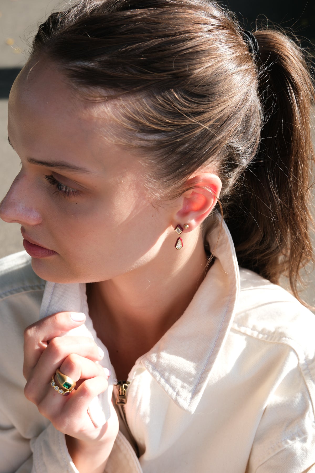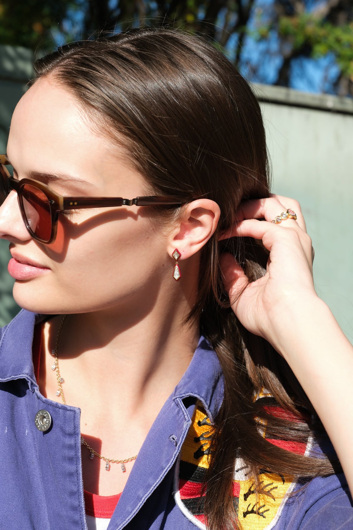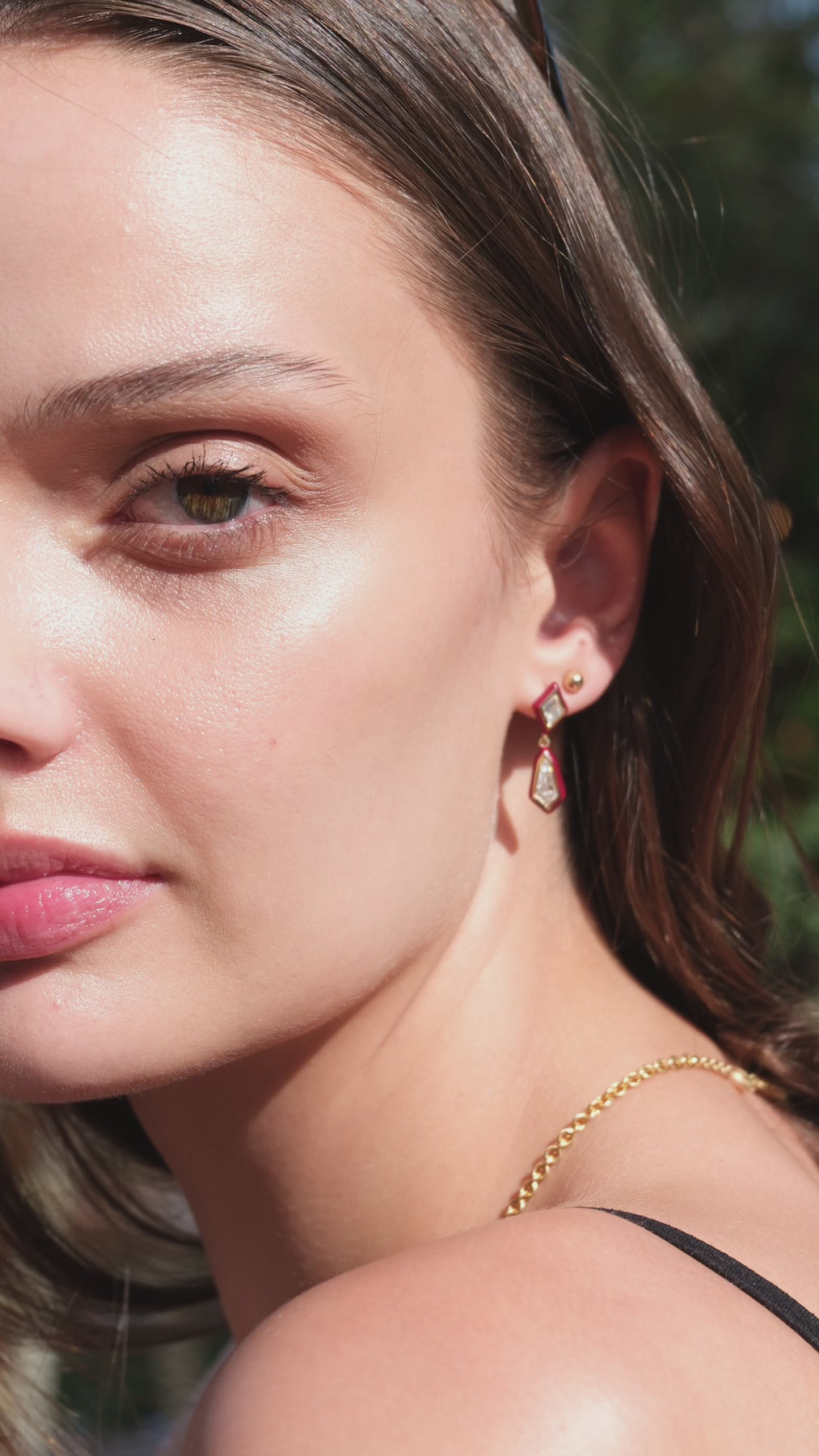.46 ct lozenge (F-G, VS1) and 1.01 ct kite (E-F, VS1) earrings with maroon enamel in 18k yellow gold