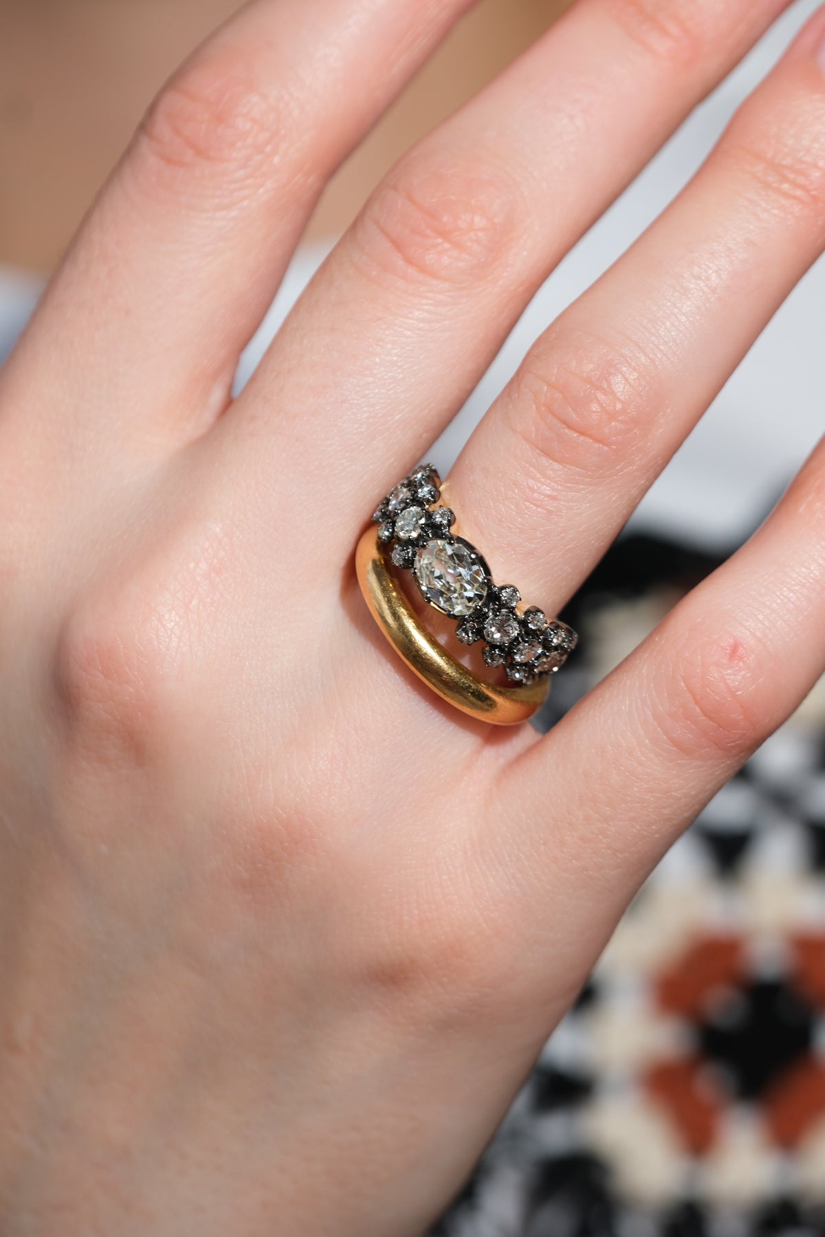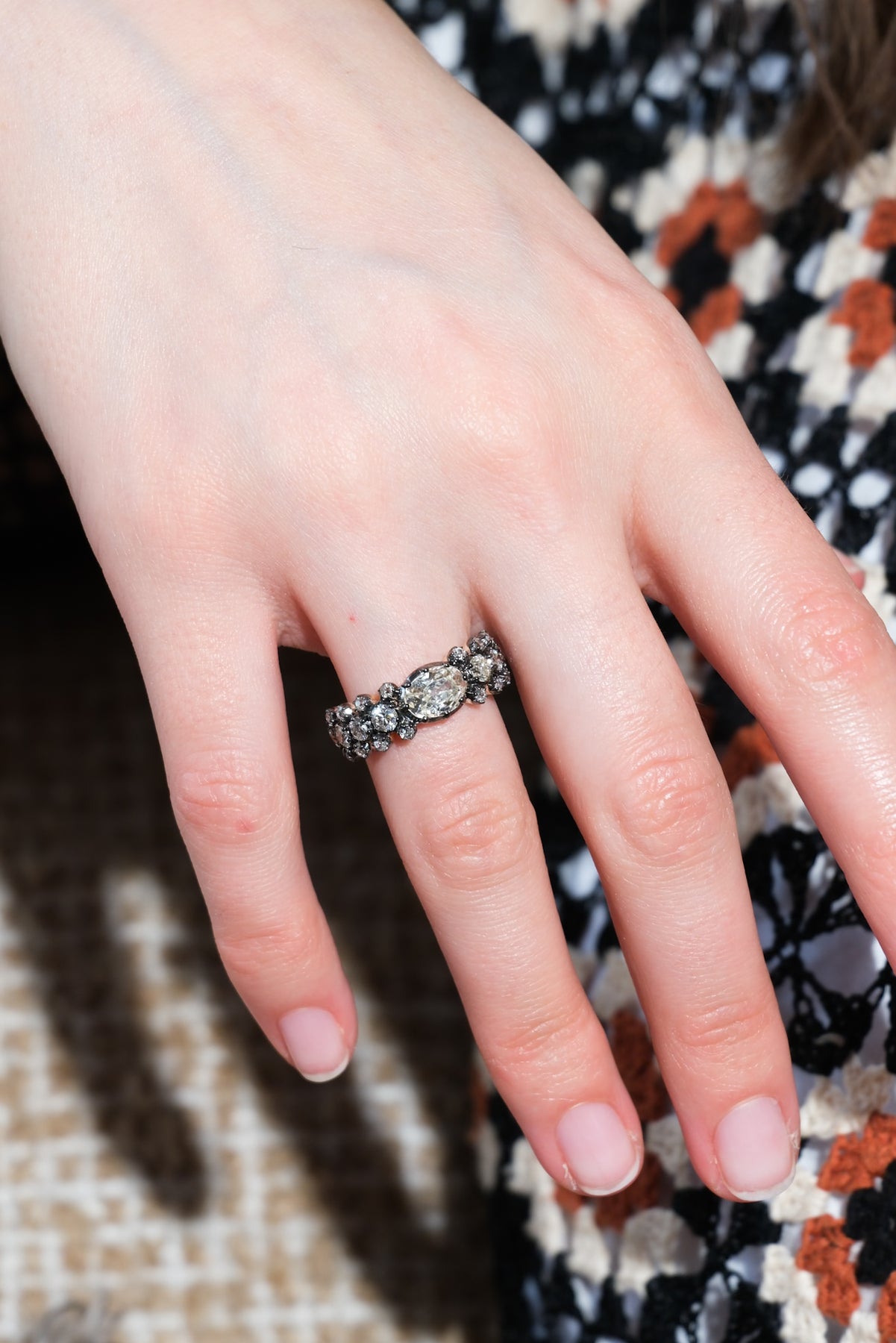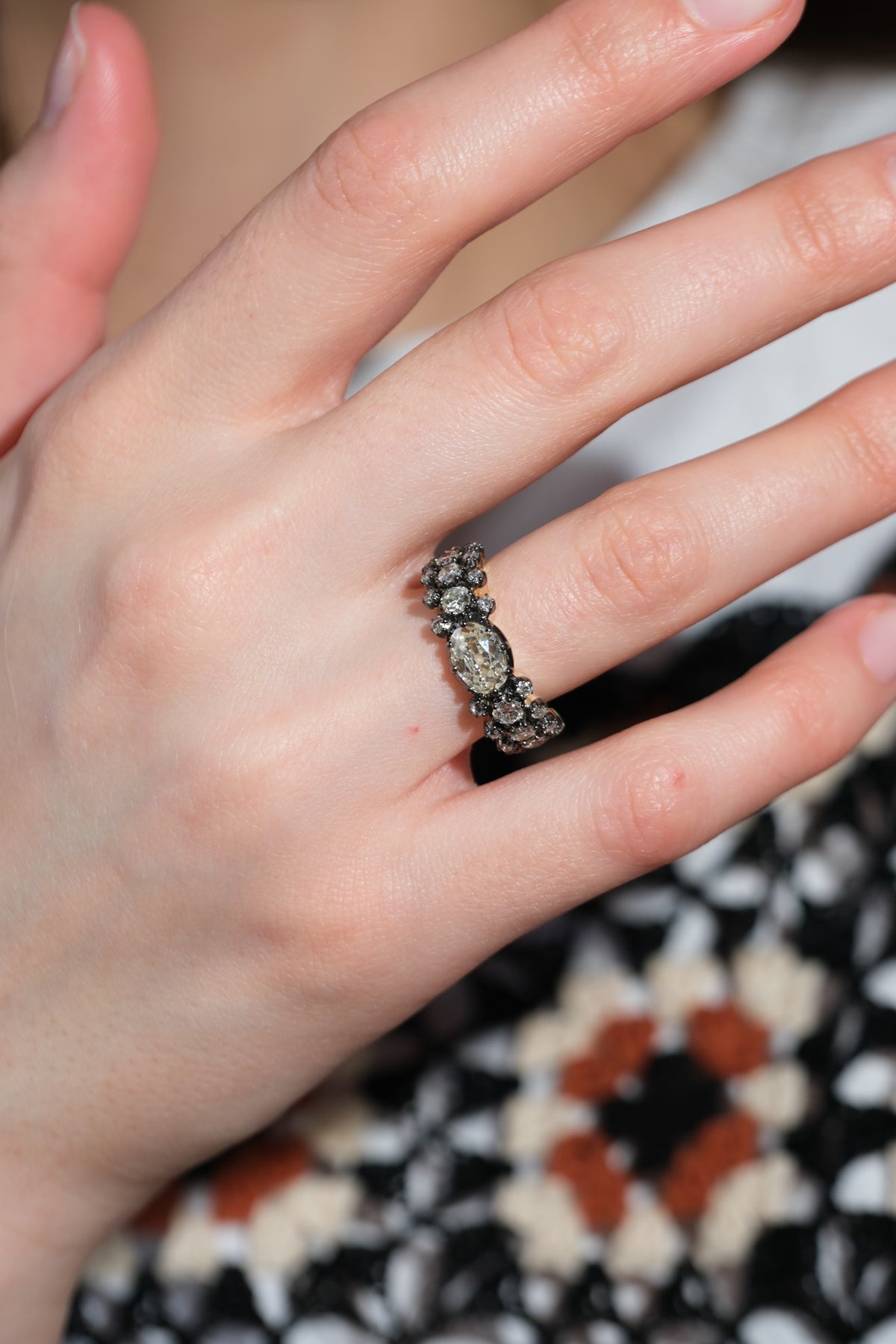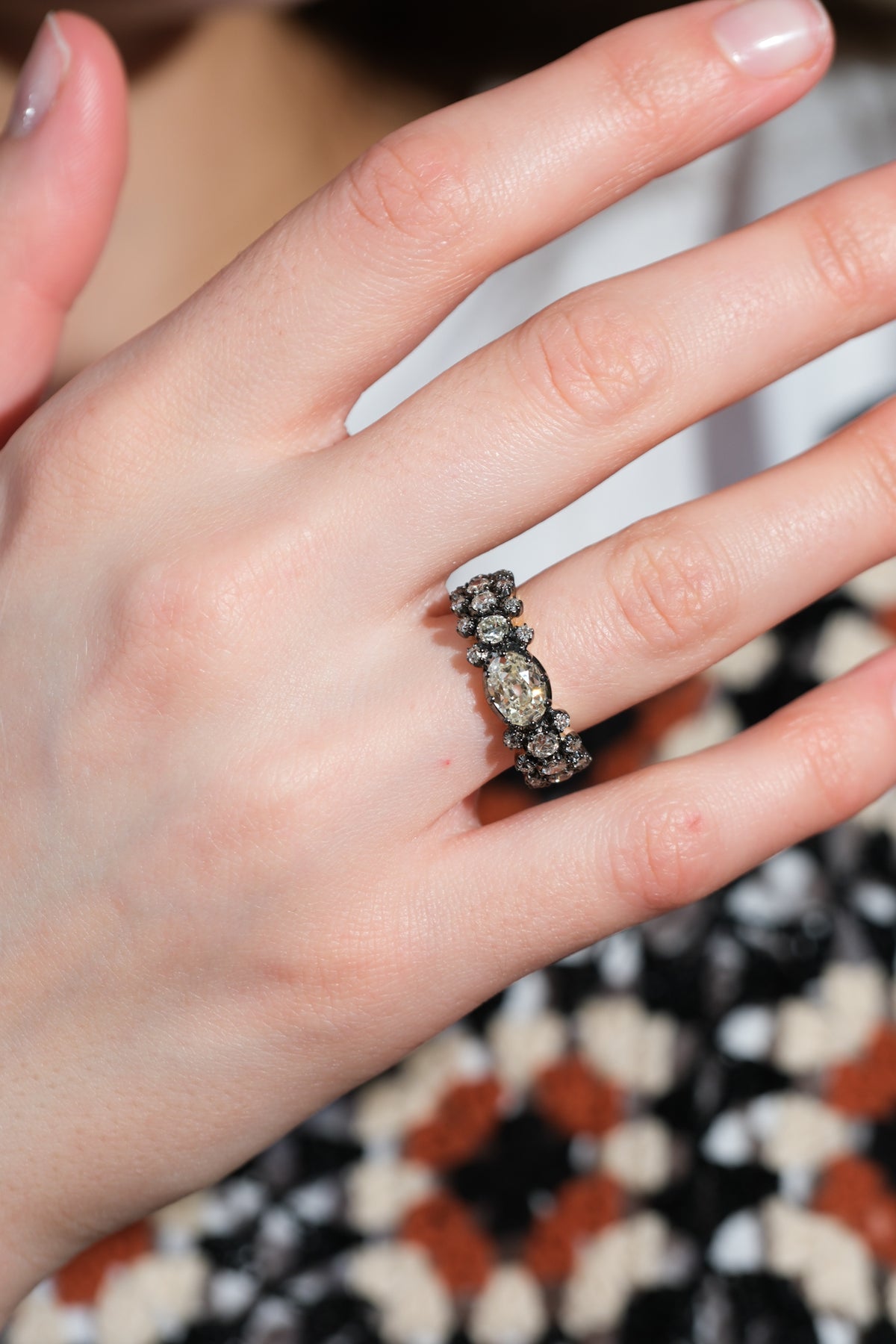 1.08 ct old mine cut oval center diamond surrounded by another 1.03 old European cut diamonds