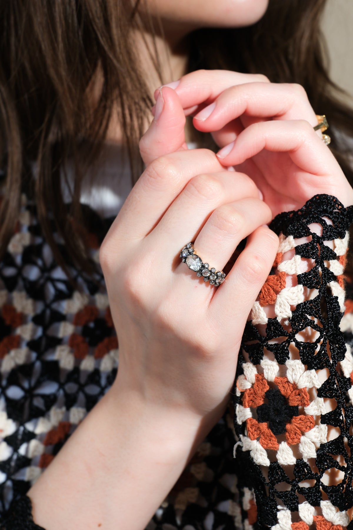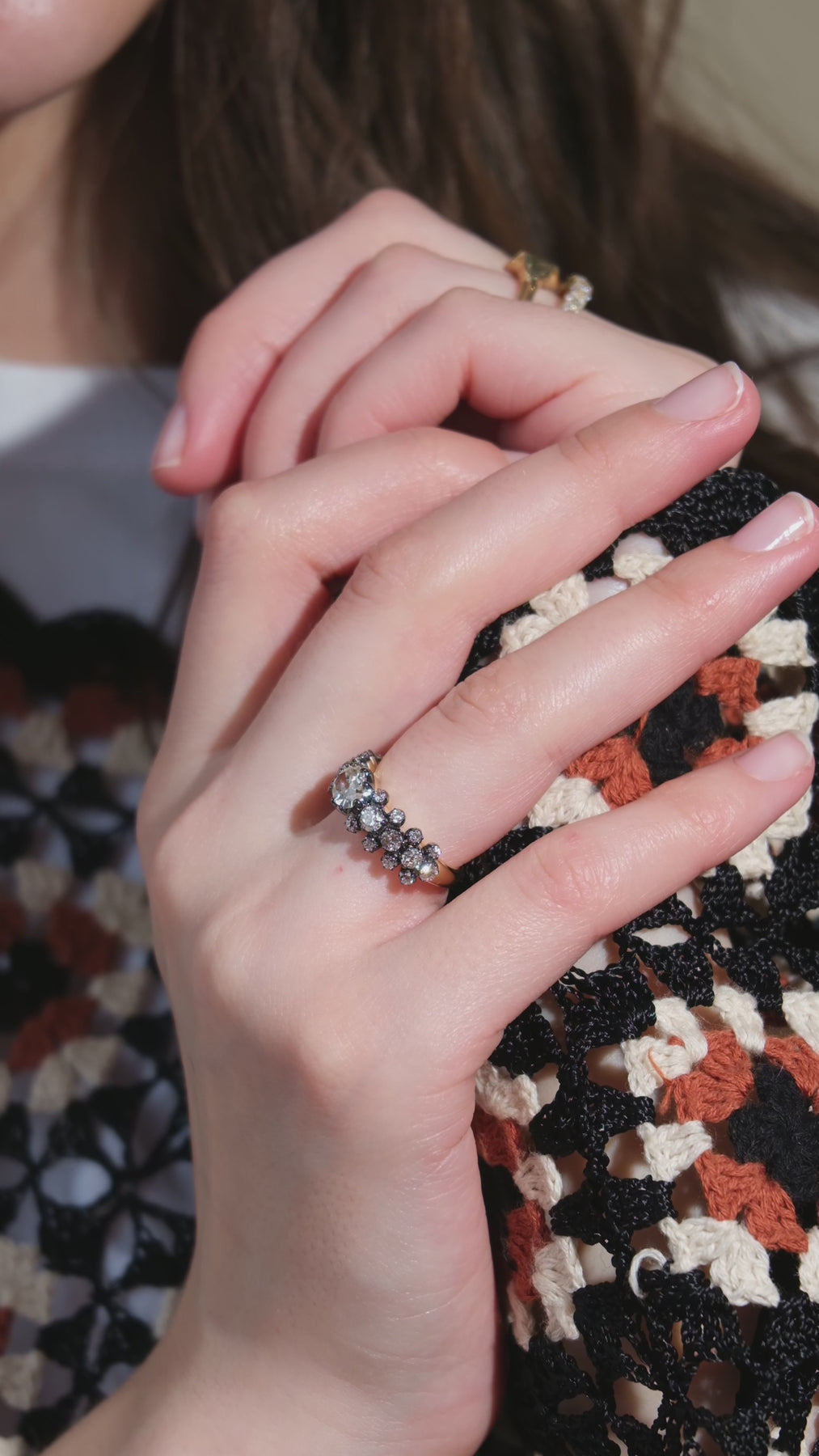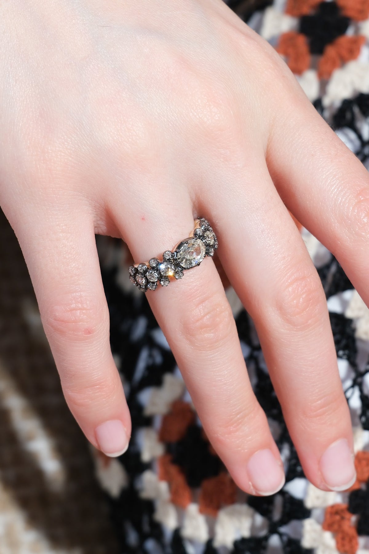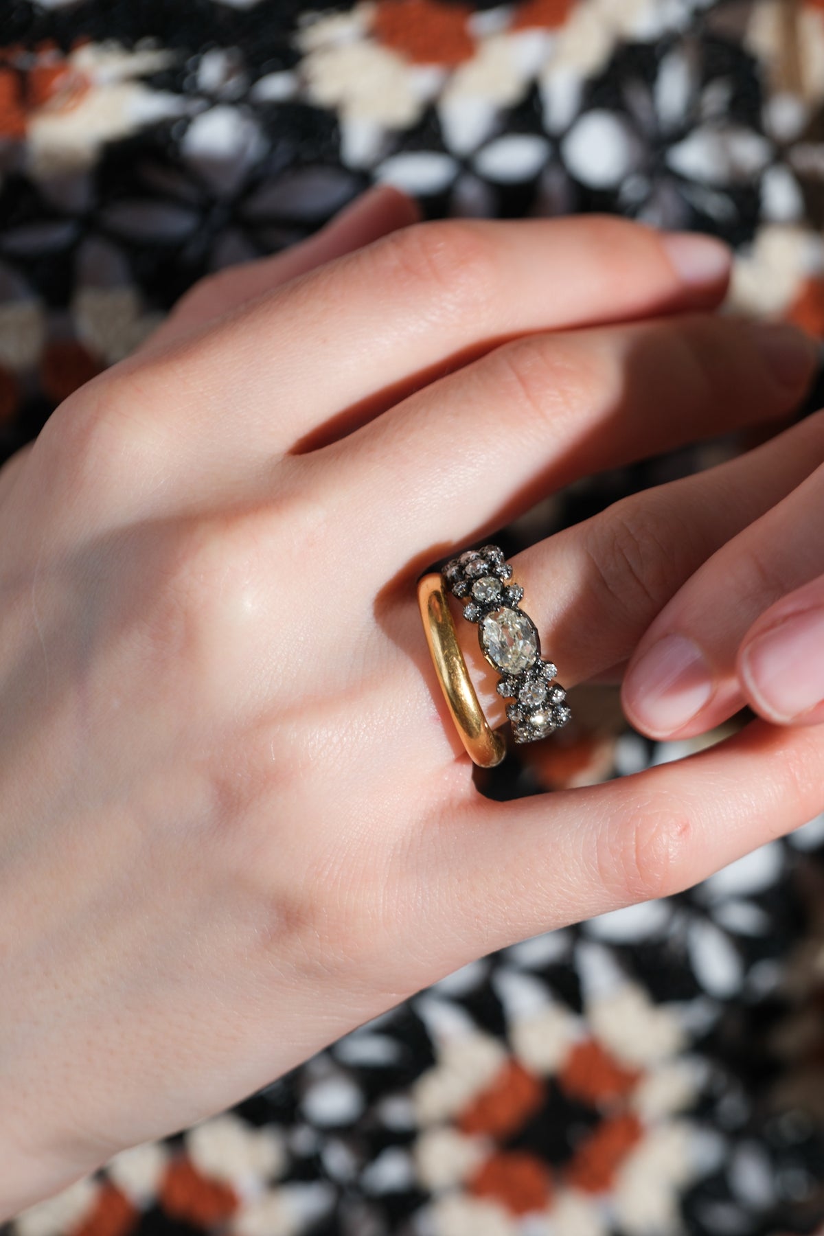 1.08 ct old mine cut oval center diamond surrounded by another 1.03 old European cut diamonds