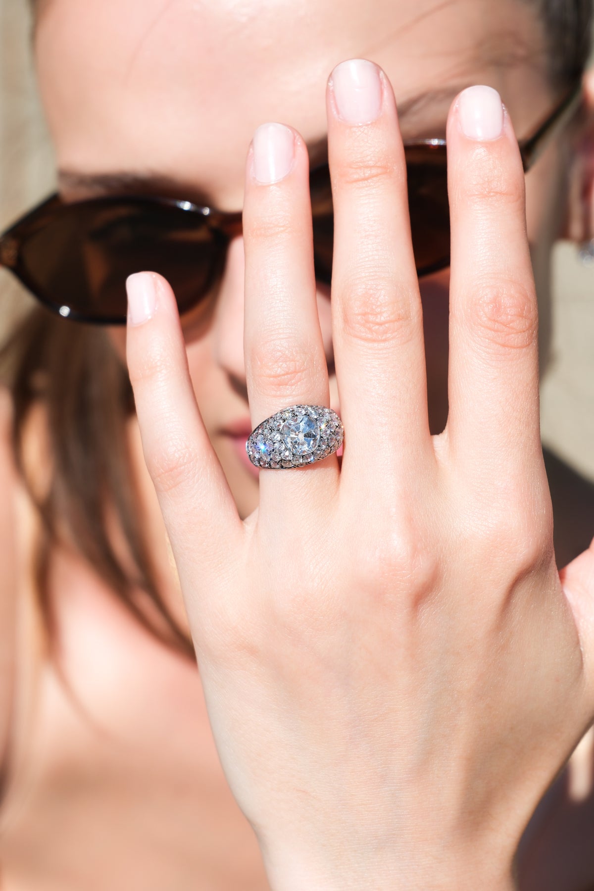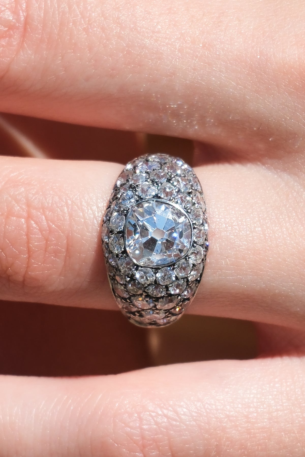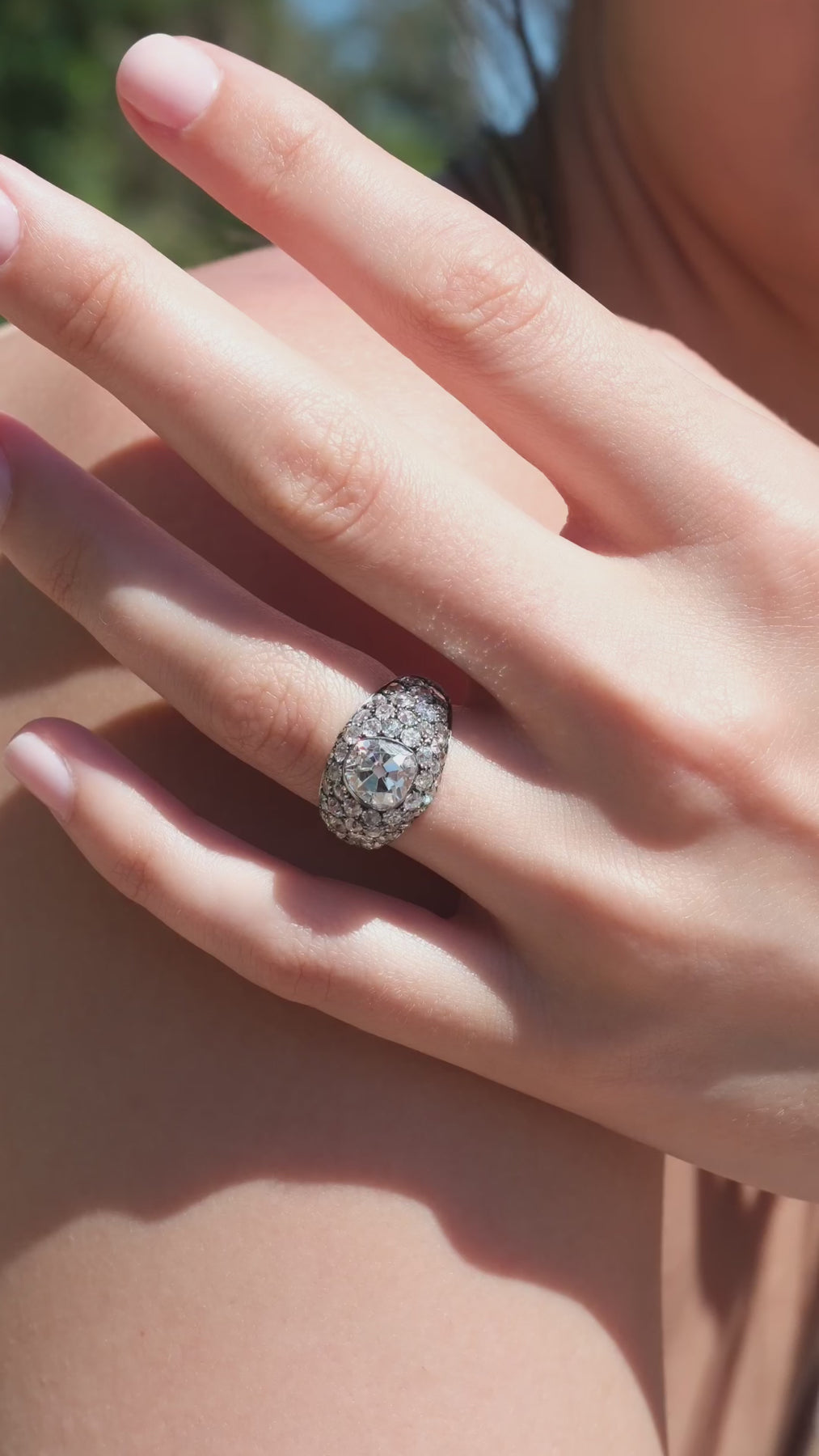 1.93 antique heart/trap diamond (H, vs2/si1) with 3.78 ct old euro/old mine cobblestone in blackened platinum