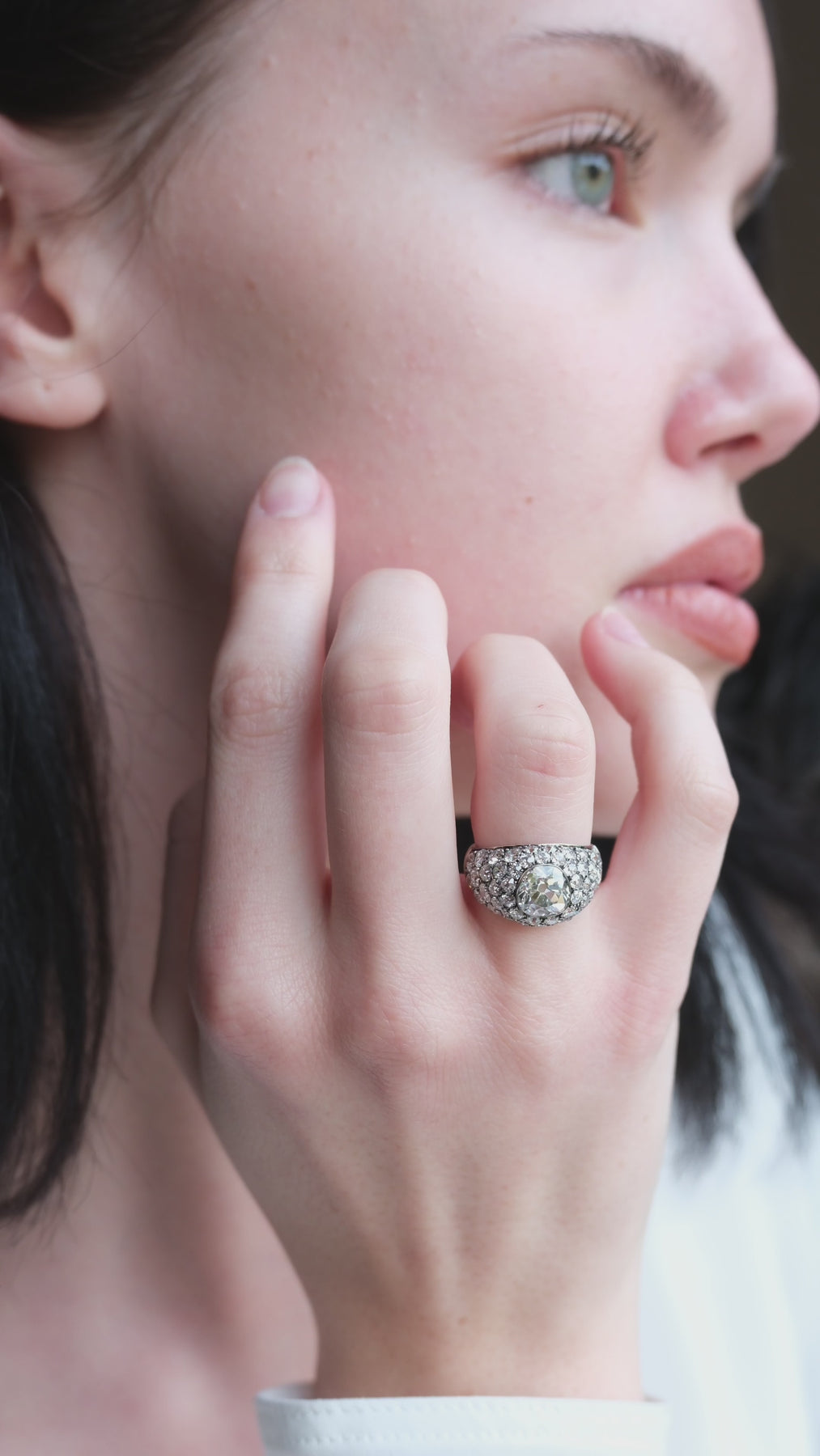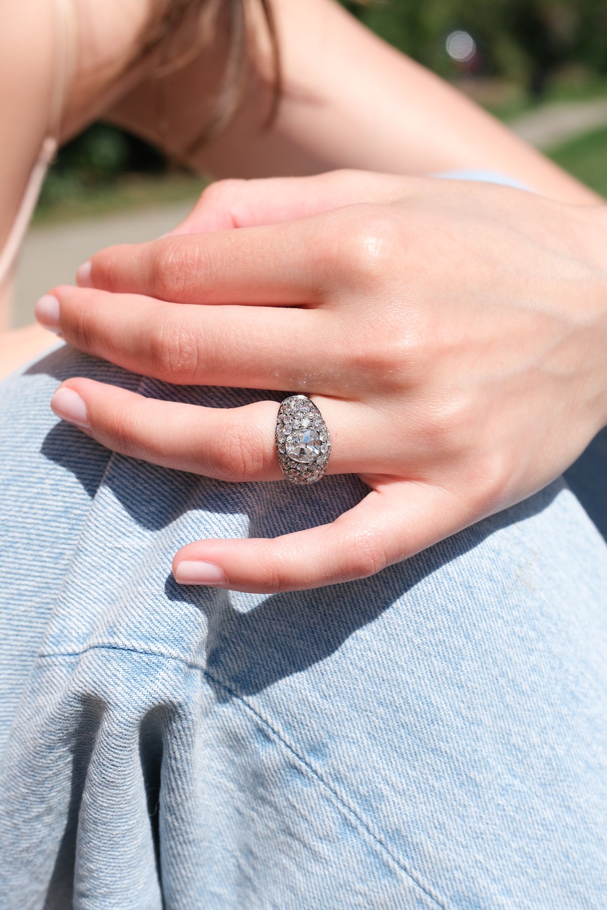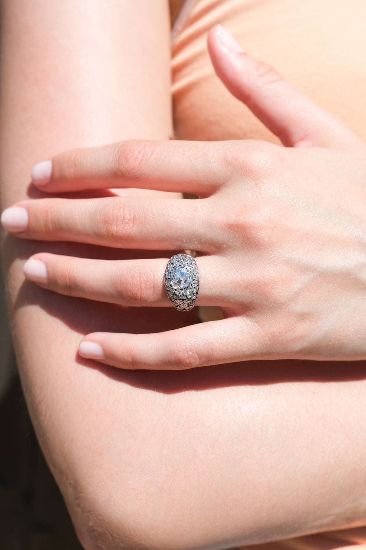 1.93 antique heart/trap diamond (H, vs2/si1) with 3.78 ct old euro/old mine cobblestone in blackened platinum